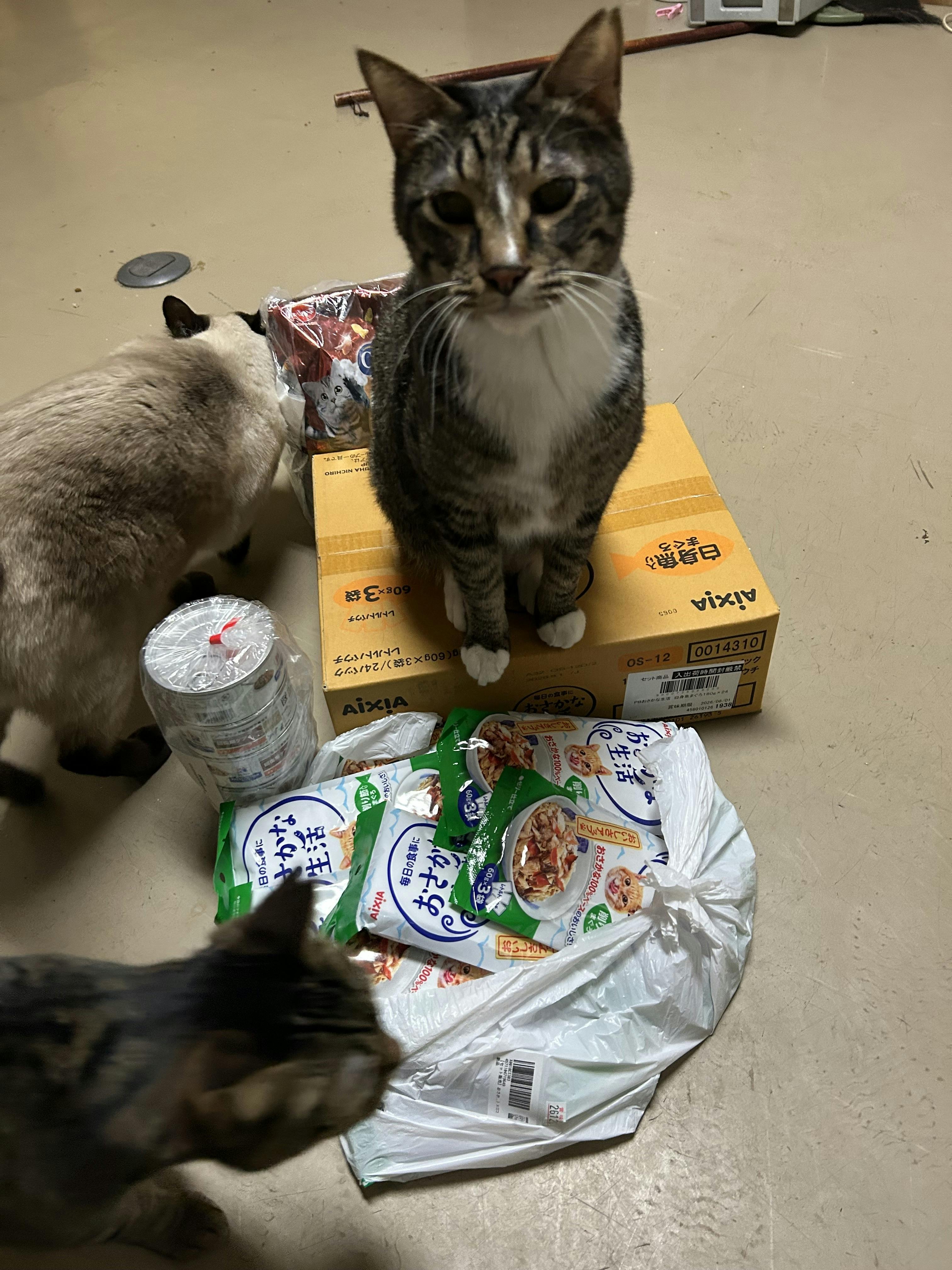 ユヤ君 ジン君 ももちゃんが受け取りました。博子さん、いつもありがとうございます。昨日も わちゃわちゃと外猫に会い、みんなをお腹いっぱいにしてあげれました。今まで、どこで食べてたん?って感じで久しぶりに会う子です