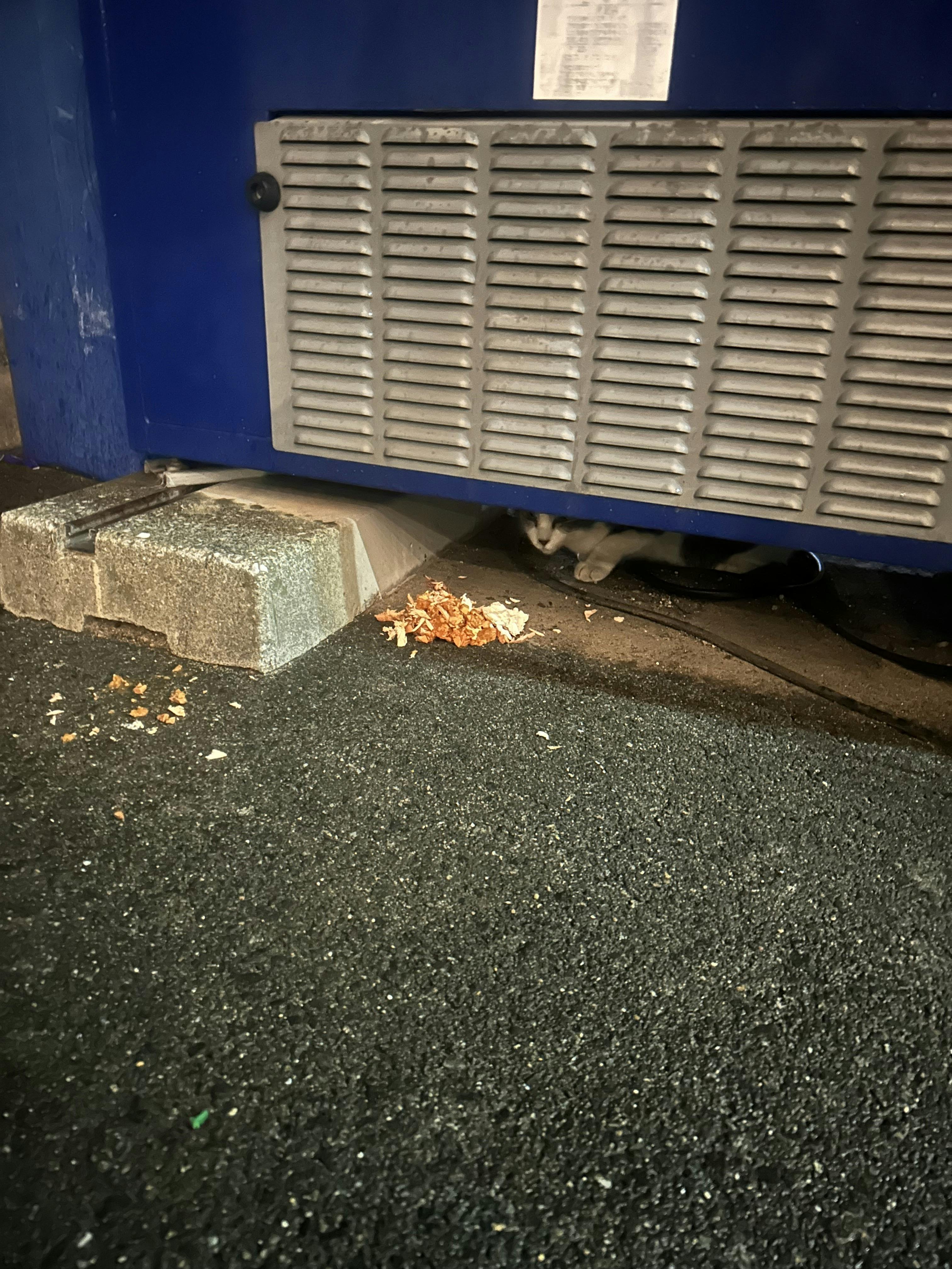 濡れないよう,自販機の下で私を待ってた琴乃ママです。小さな体だから出来る。昨日も無情の雨でした.この冬一番、つらい配達でした。不憫な子達に出来ることは,温かいフードを食べさせるだけなんて微力過ぎます。クシャミしてる子には薬を混ぜました。ぽちたま薬局で輸入してます。今月も薬代がかさみました。堺は今青空です。風が強くて体感温度は低い。みんなどこでいるのか、、