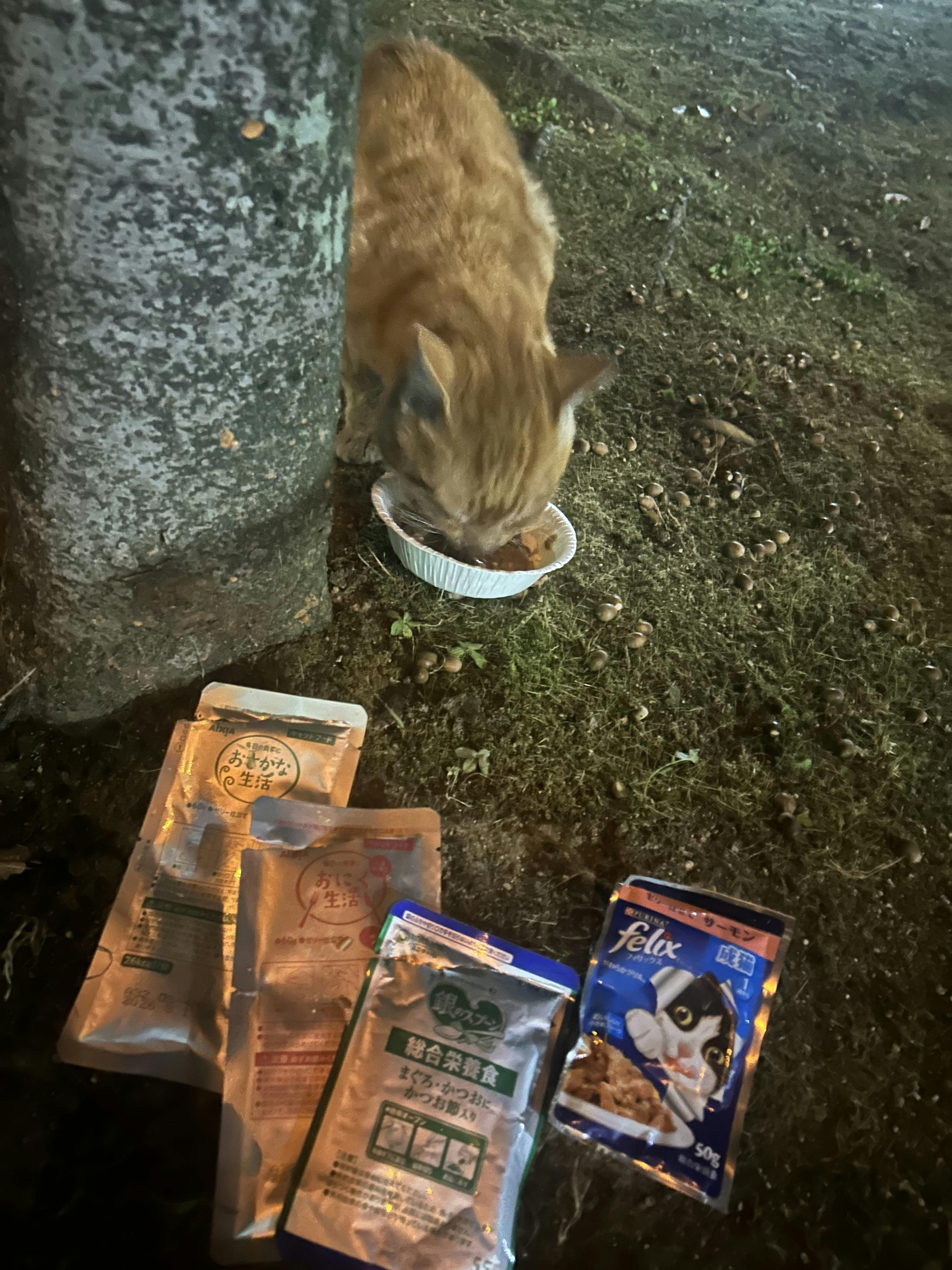 チャトラに会えそうと思ってました。会えました.きっと,いつもエサをくれてる人がお正月なのでしょう。先日より体調が良いみたいでした。これだけ食べ,カツオを咥えて帰りました。薬混ぜました。紀伊は今夜も元気です。来る年も健やかでいてくれますね。今年最後の買い物はキャットフードでした。誠に私らしいと思います。今年は毎月二回、堺を留守にしました。志しを同じとする友にエサをあげてもらいました。365日-24日13箇所にエサを届けました。フードご支援をくださるから出来たことです。お力添えに感謝します。ありがとうございました。また1時間後から後半猫達に届けにいきます。新しい年も,無事でありますように。皆様,良いお年をお迎えくださいとある公園よりHori