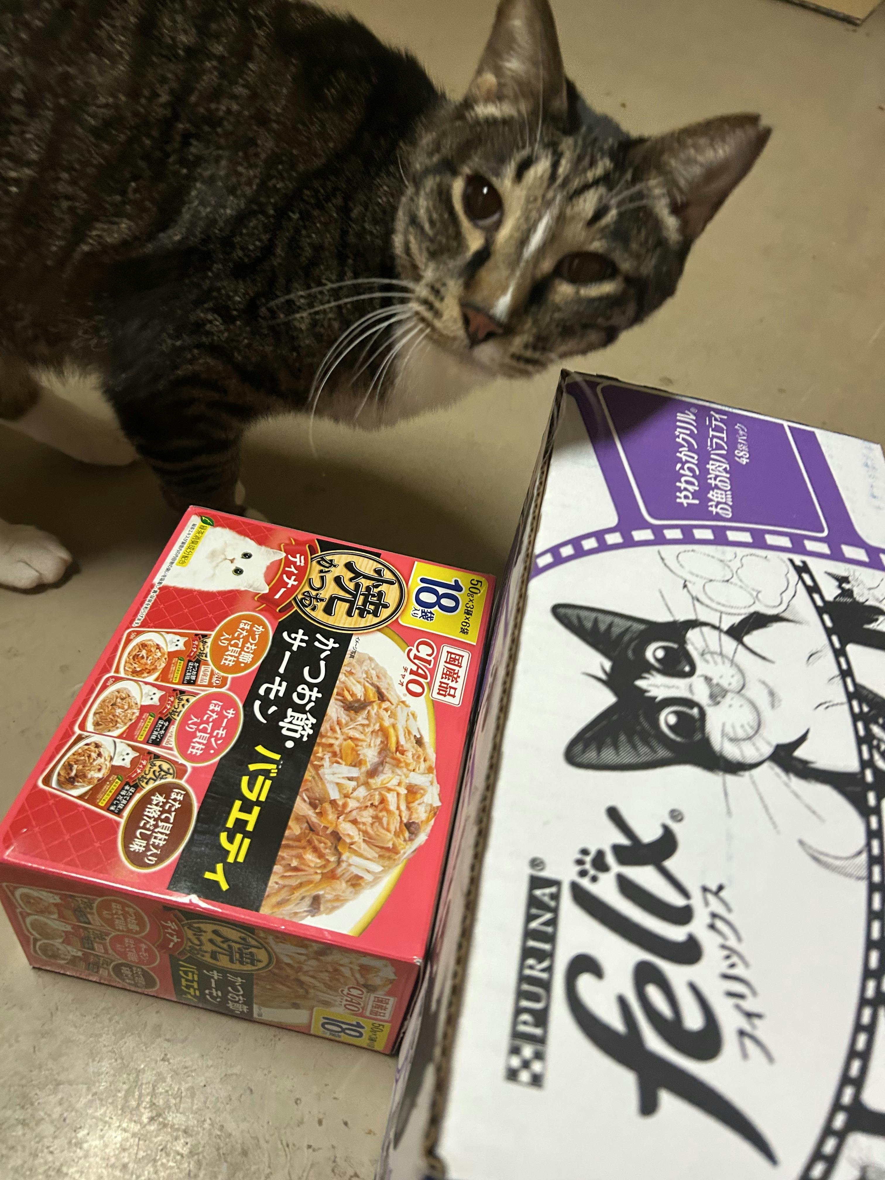 優子さん、ユヤ君と一緒に受け取り致しました。必要な物が目の前にあると、これを食べてるニャンの喜んで弾む鳴き声が聞こえてくるんです。贈ってくださりありがとうございましたユミエさん欠かせられないパウチをありがとうございます。助かった〜って感謝してます。美保さんありがとうございます。みんな大好きフードの詰め合わせです!幸せをありがとうございます。今年も応援してくださいね、私は微力で,彷徨ってばかり、皆様のお力添えで今日め給食おばさんになれるのです。ありがとうございます
