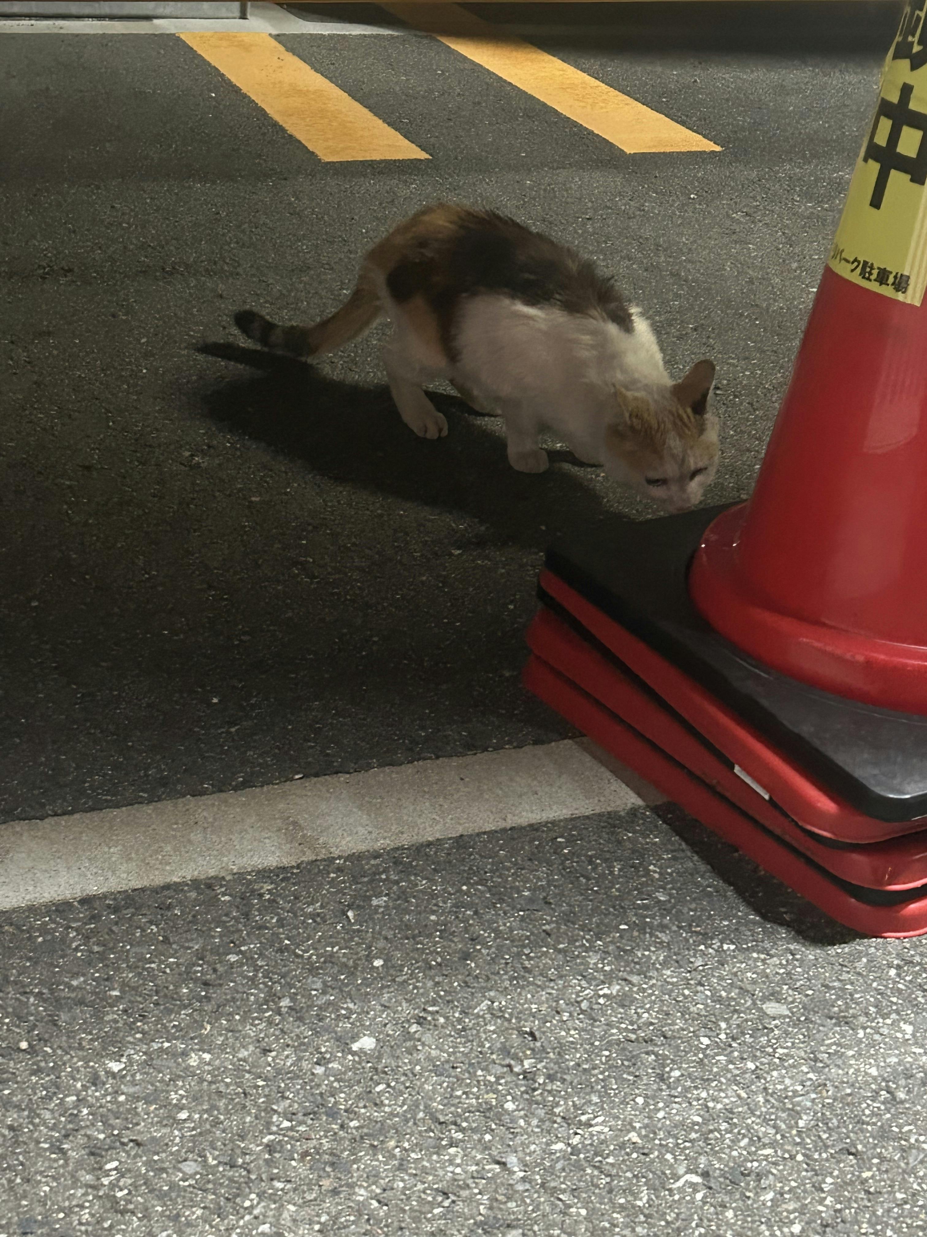 この三毛ちゃんは、ここでオジサンからフードをもらってます。私は毎晩この横を通り、シェルターに行きます。タイミングが合えばニャンニャンと呼び止めてパウチを2つ食べるんです。ところが、、一昨日、とある公園のチャトラ君が来る場所から、ひょこっと現れたんです。その時の写真えーっ!あなたも紀伊のように、あの道路を渡ってきたのね?あちゃーあかんわ!とりあえずエサをあげ無事に戻る誘導をしました。それで昨夜は三毛ちゃんが現れるのをいつもの場所で待ちました。また心配事と常連猫が1匹増えました。ちょっと痩せてるのが気になります。栄養つけましょ。