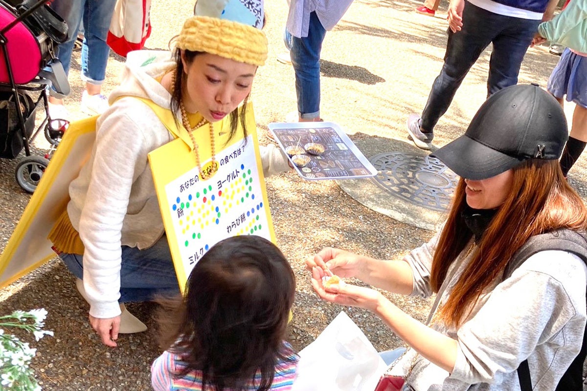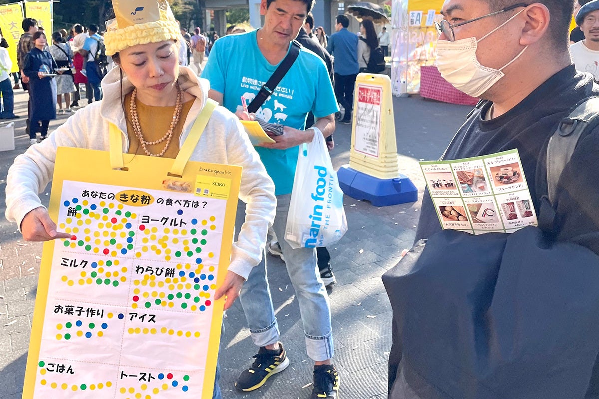例えば、きな粉の袋を衣装として頭に装着するスタイルでの発信や、アンケートボードを身に付けてのイベント出演、きな粉の食べ比べ付きのオリジナルワークショップ「きききなこ」の開発、きな粉をテーマにした曲「きなこソースの歌」のリリースなどを実施しています。