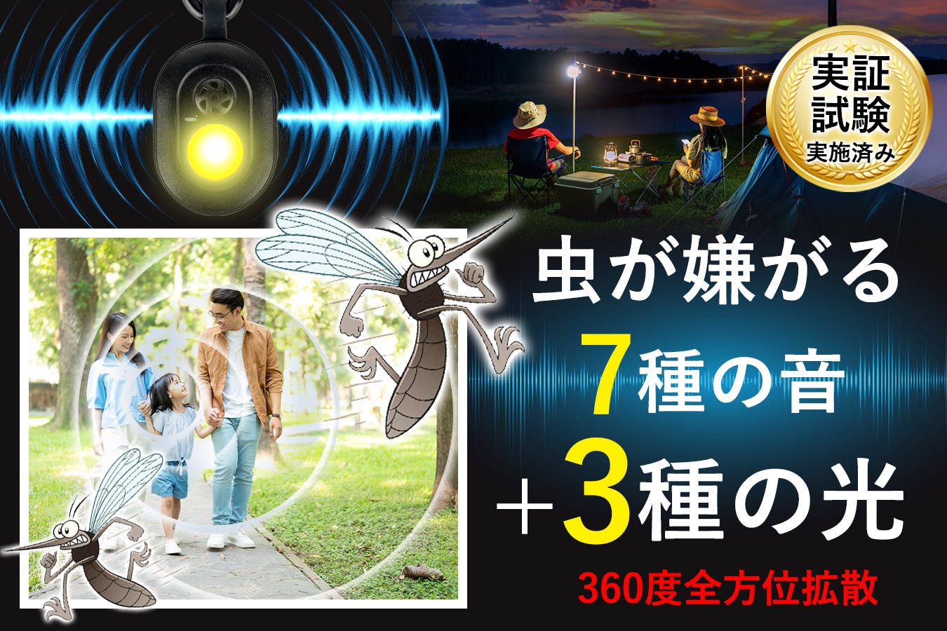 ①虫が嫌がる7種の音に3種の光をプラス!あらゆる虫に見えないバリア