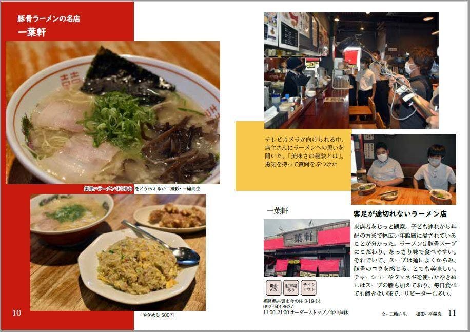 他の豆本では、高校生や大学生ラーメンをよく取り上げています。豚骨ラーメンを大好きな女子高生もいました(お父さんの影響らしい)。実際の誌面を紹介します。3月発刊の「息子の青春ラーメン豆本」も同じ記事トーンで制作します。