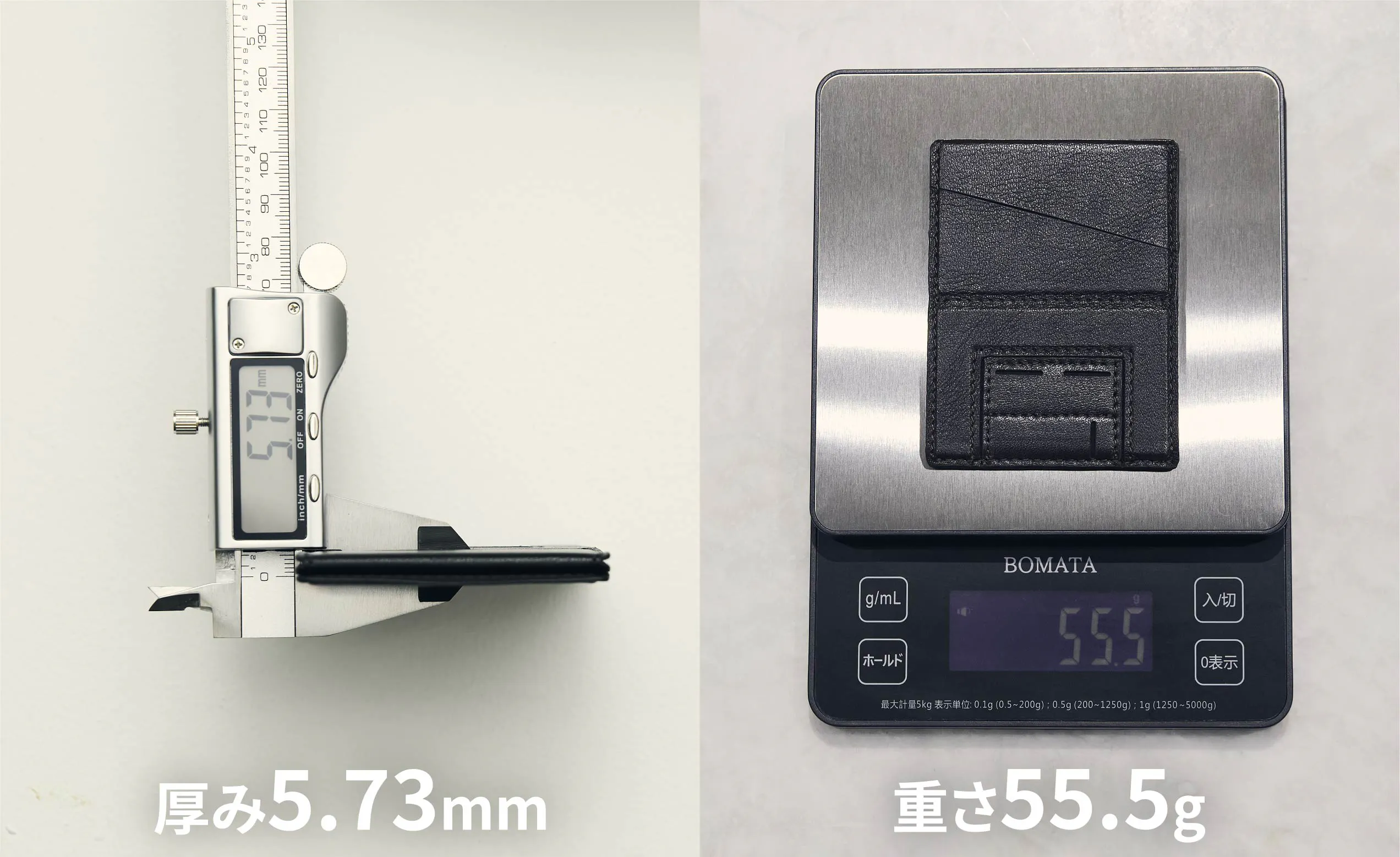 「硬貨」4枚、「紙幣」1枚、「各種カード」2枚、「microSDカード」2枚、「SIMピン」1本を、厚み6mmの中へスマートに収納。