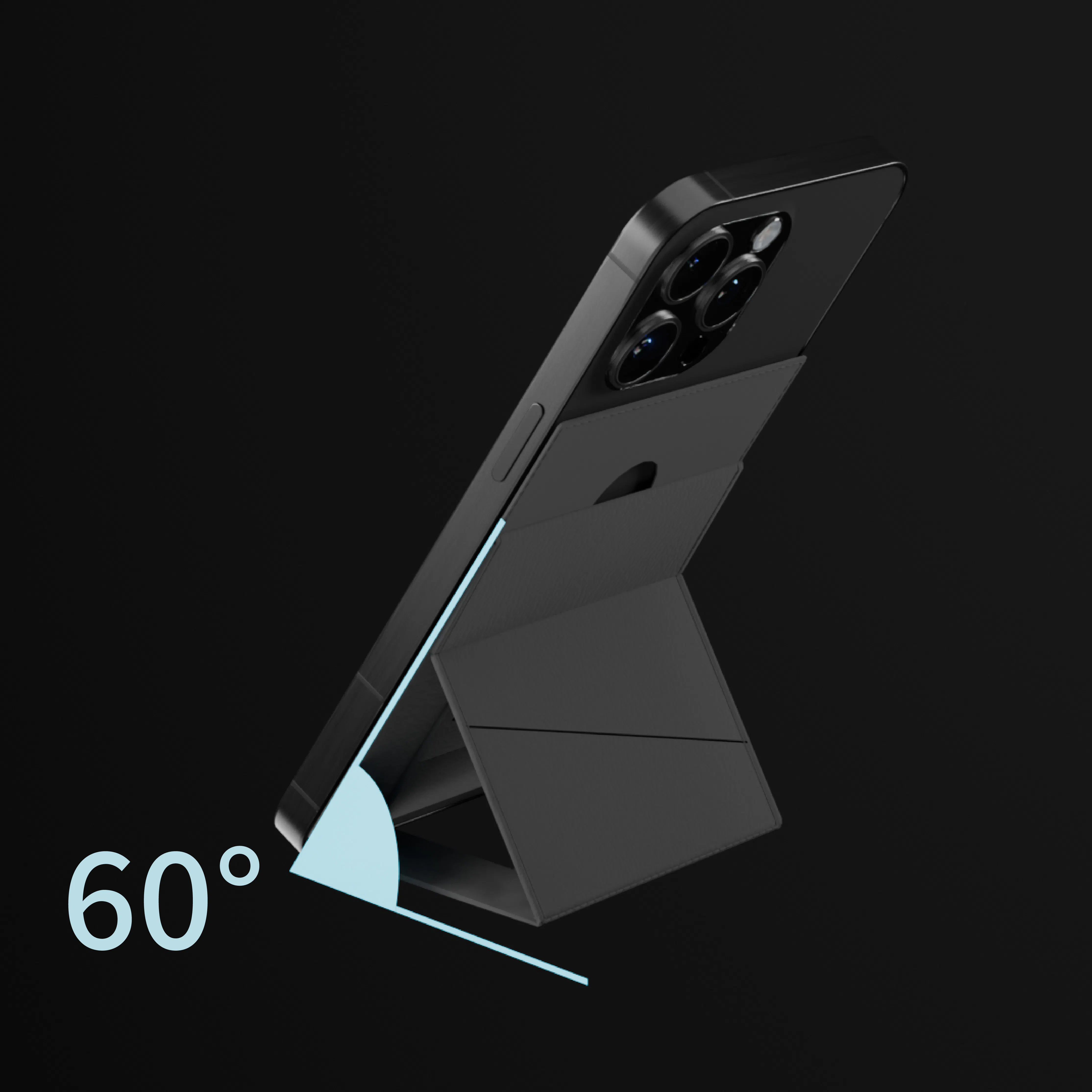 3WAY TECH-WALLETは、瞬時にスマホを約60°で固定できるため、快適な姿勢でスマホ操作が可能です。