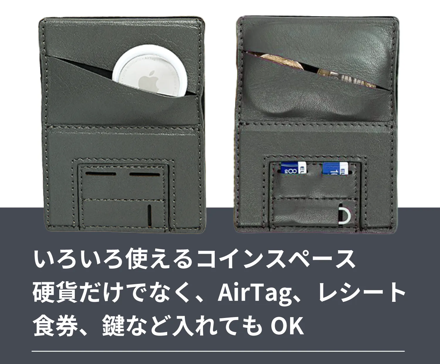カードのみを収納できる商品はありますが、薄型で硬貨やAirTagも収納できるタイプは、私たちの調査では他にありませんでした。