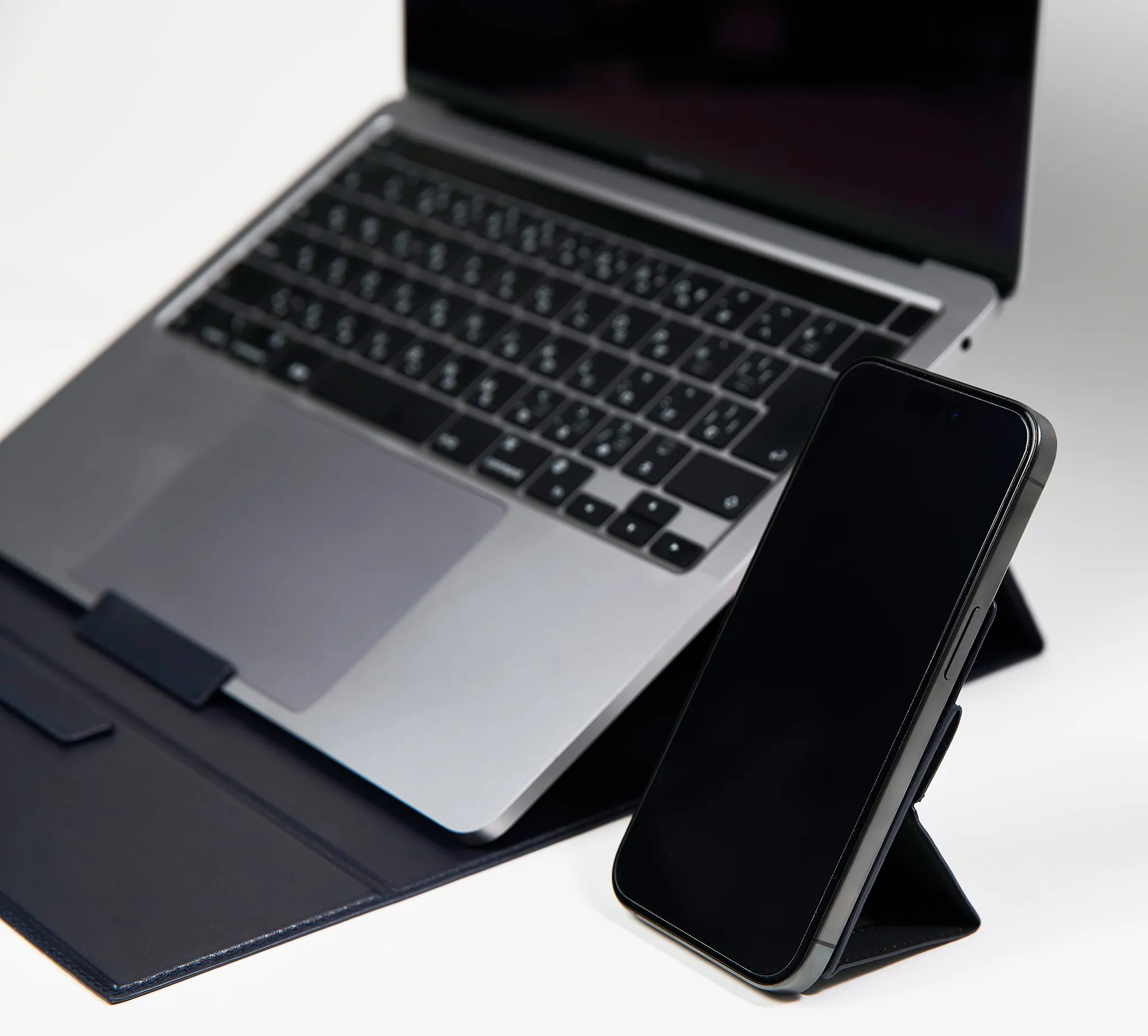 マグネット内蔵のLEATHER ORIGAMI®︎のパソコンケースに貼り付けて持ち運ぶコトも可能。