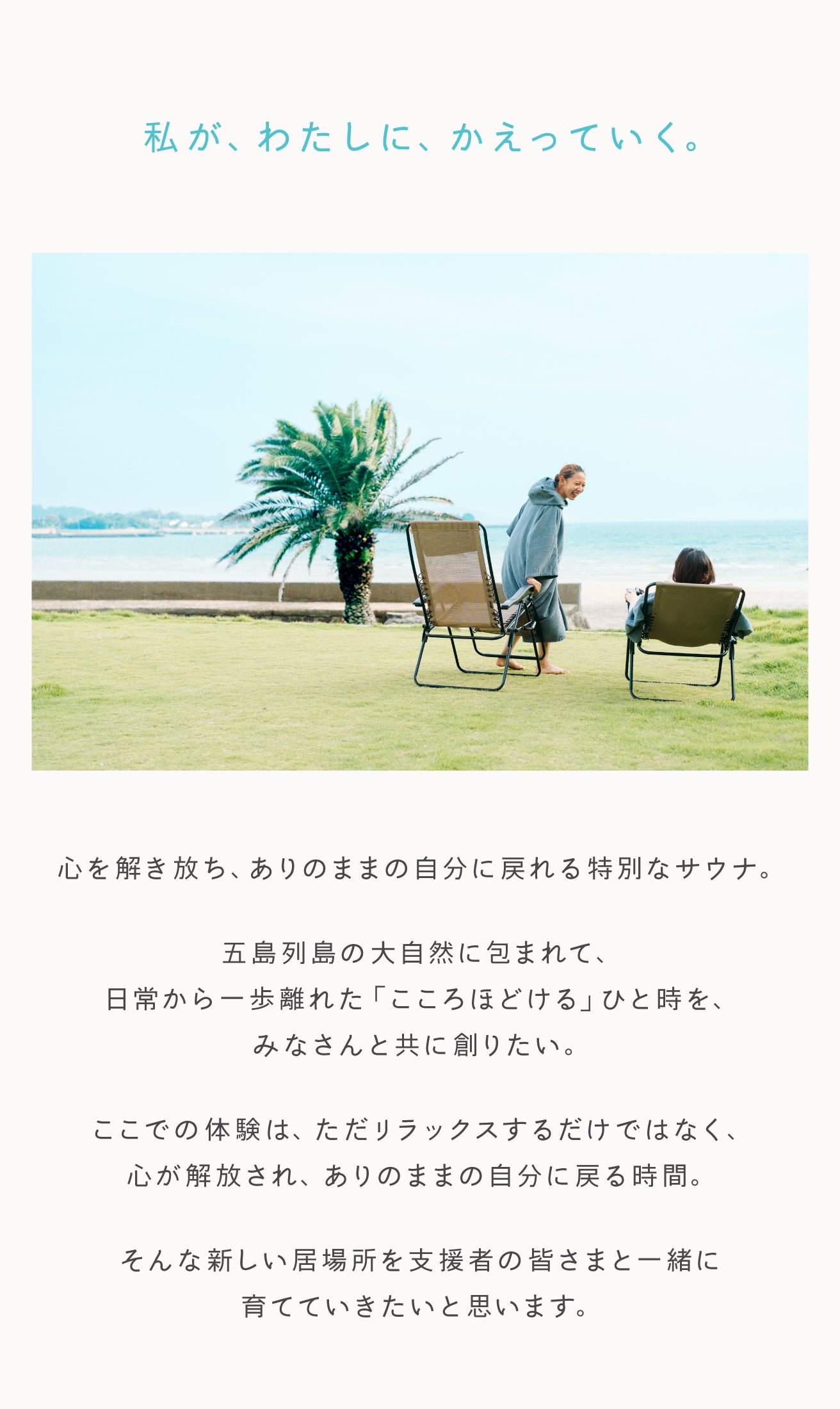 今回のアウトドアサウナのプロジェクトでも、この想いにまっすぐ向き合っていきますので、皆さまどうぞご支援いただけますと嬉しいです。ぜひ五島列島に遊びにきていただき、一緒にからりとした乾杯をしましょう!