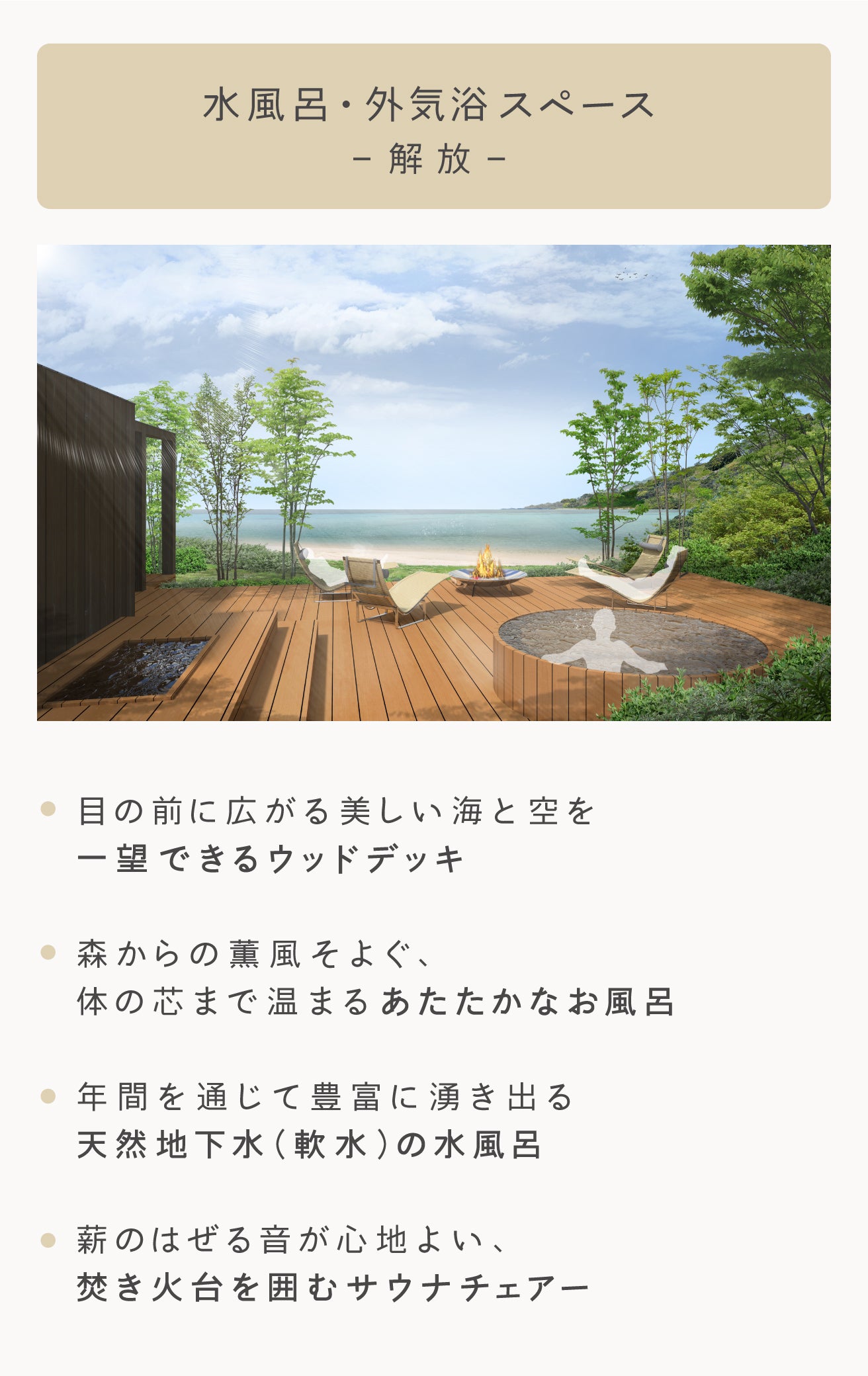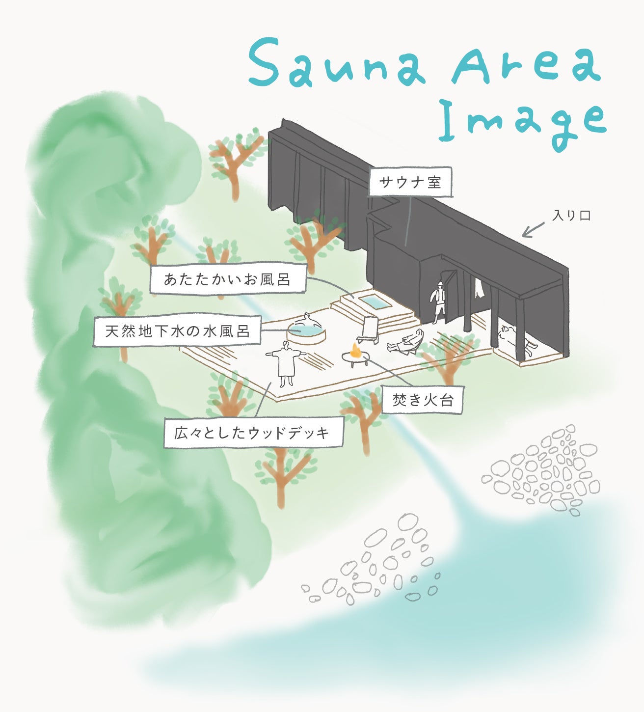 これらのイメージに準え、サウナ室と外気浴スペース(水風呂含む)を以下のようにデザインすることにしました。