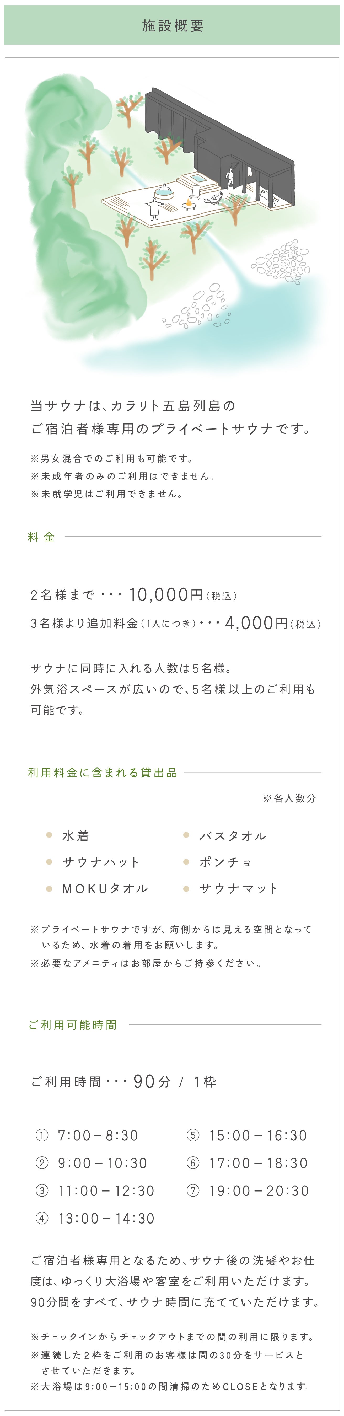 2025/04/10 12:00カラリト五島列島「こころほどける」サウナプロジェクトを応援していただき、誠にありがとうございます。皆様の温かいご支援のおかげで、順調にプロジェクトを進めることができています。そして本日より、「Colorit Sauna」のご予約受付 を開始いたします。皆様のご予約をお待ちしております!【ご予約について】受付開始日:2025年4月10日~ご予約方法:公式HP内、「Facility」ページから注意事項:※サウナチケットリターンのご支援者様は、予約フォーム「備考欄」に「クラウドファンディングの支援者」とご記載ください。※リターン品の説明欄にも記載しましたが、「Colorit Sauna」のご利用は宿泊者様限定です。先に宿泊のご予約を完了してから、サウナのご予約をお願いいたします。また、ご宿泊はカラリト五島列島の公式HPよりご予約ください。https://colorit.jp/利用期間2025年6月1日~2026年12月31日利用時間(90分/枠)7:00 - 8:309:00 - 10:3011:00 - 12:3013:00 - 14:3015:00 - 16:3017:00 - 18:3019:00 - 20:30料金2名様まで:10,000円(税込)3名様上:追加4,000円(税込)/人※定員は5名ですが、5名以上で利用されたい方は個別にお問合せください。貸出品(料金に含まれています)水着サウナハットMOKUタオルバスタオルポンチョサウナマット五島の豊かな自然の中で、心ほどけるひとときをお楽しみください。皆様のご来訪を、スタッフ一同心よりお待ちしております。カラリト五島列島平﨑雄也 スタッフ一同 もっと見る