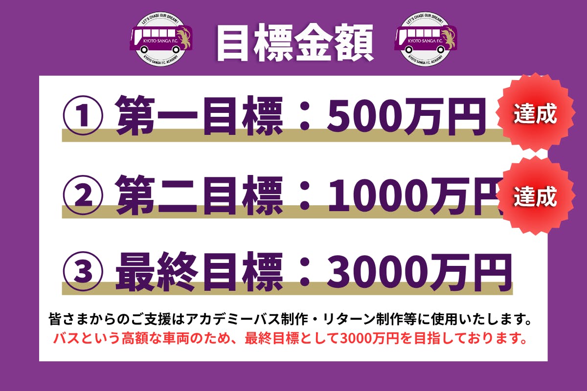 2025/06/16 12:01京都サンガF.C.でございます。2025年4月21日からスタートしました「京都サンガF.C.アカデミー選手のバスをリニューアル」プロジェクトが昨日6月15日をもちまして終了いたしました。最終目標を達成することはできませんでしたが、この間、多くの皆様からのご支援により、1,300万円を超える貴重なご支援をいただきました。ご支援をいただきました皆様、誠にありがとうございました。【結果】 最終目標金額 30,000,000円 支援総額 13,649,000円 支援人数 816人皆様からいただきましたご支援につきましては、アカデミーバスの製作費等に活用させていただきます。また、いただきましたご支援によりまして、新しいアカデミーバスは未来のサンガを担うアカデミー選手達により安全で快適な移動環境の提供などに大きく貢献するものと考えております。皆様のご支援が実を結ぶアカデミーバスに、ぜひご期待ください。引き続き、京都サンガF.C.へ熱いご支援を賜りますよう、よろしくお願い申し上げます。 もっと見る