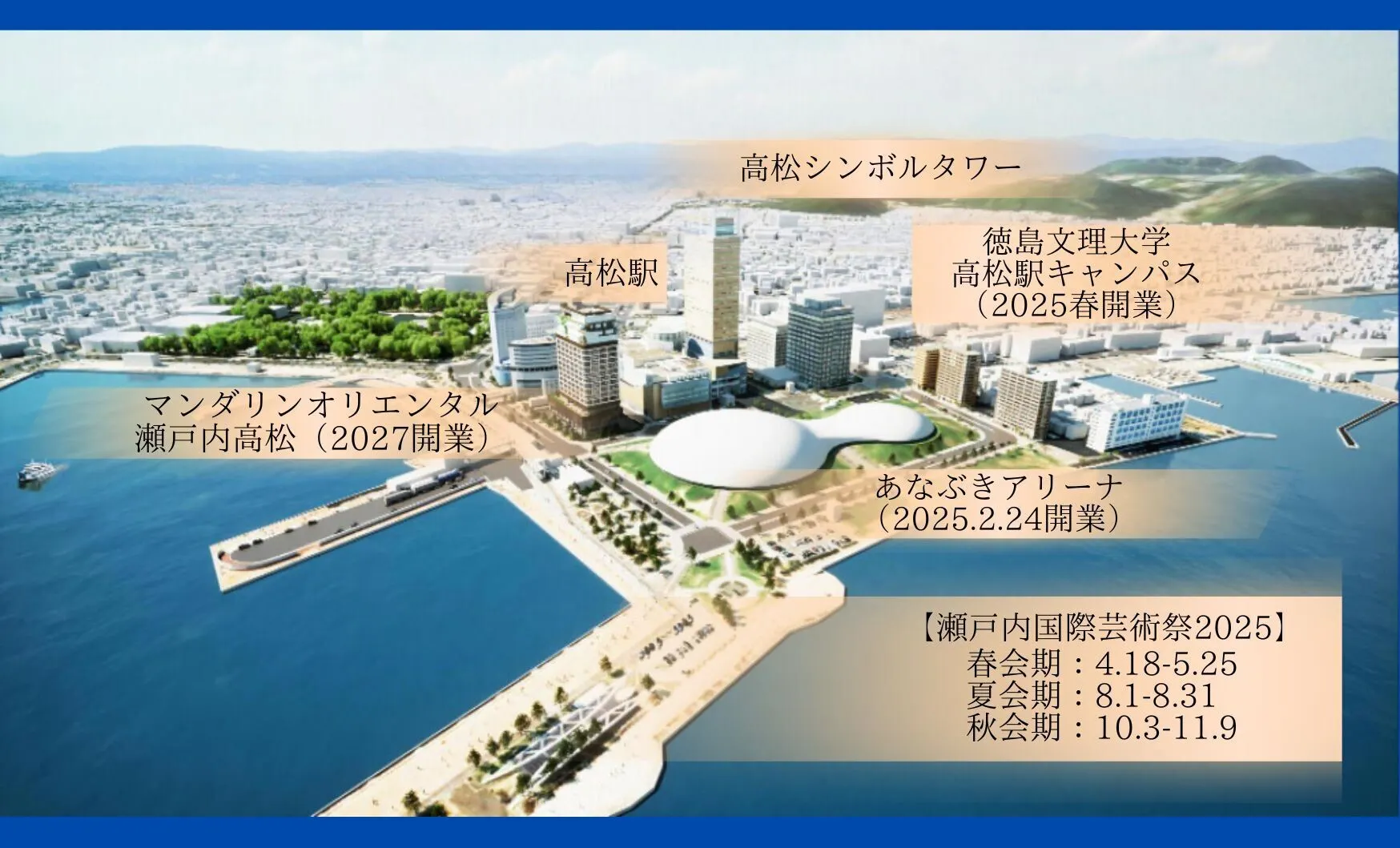 そんな中、高松市の現状として、瀬戸内国際芸術祭や海外からの高松空港への直行便増便等もあり観光客が急増しており、せっかくお越し頂いても高松の街(特にナイトタイムエコノミー)を楽しむ場が少なくとても残念な状態です。また、高松駅エリア(サンポートエリア)には来春オープンの「あなぶきアリーナ香川」は中四国最大の1万人を収容できる初めてのアリーナとしてオープンします。と同時に、2025年には徳島文理大学の高松駅キャンパスが開校したり、4年に1度の「瀬戸内国際芸術祭2025」も開催予定です。また、2027年オープン予定の「マンダリンオリエンタル瀬戸内高松」の着工も発表されており、人の賑わいが見込める要素がたくさんあるにも関わらず、中心となるサンポートエリアの店舗に空きが目立っており、周辺利用者の受け皿が十分でないのが現状です。