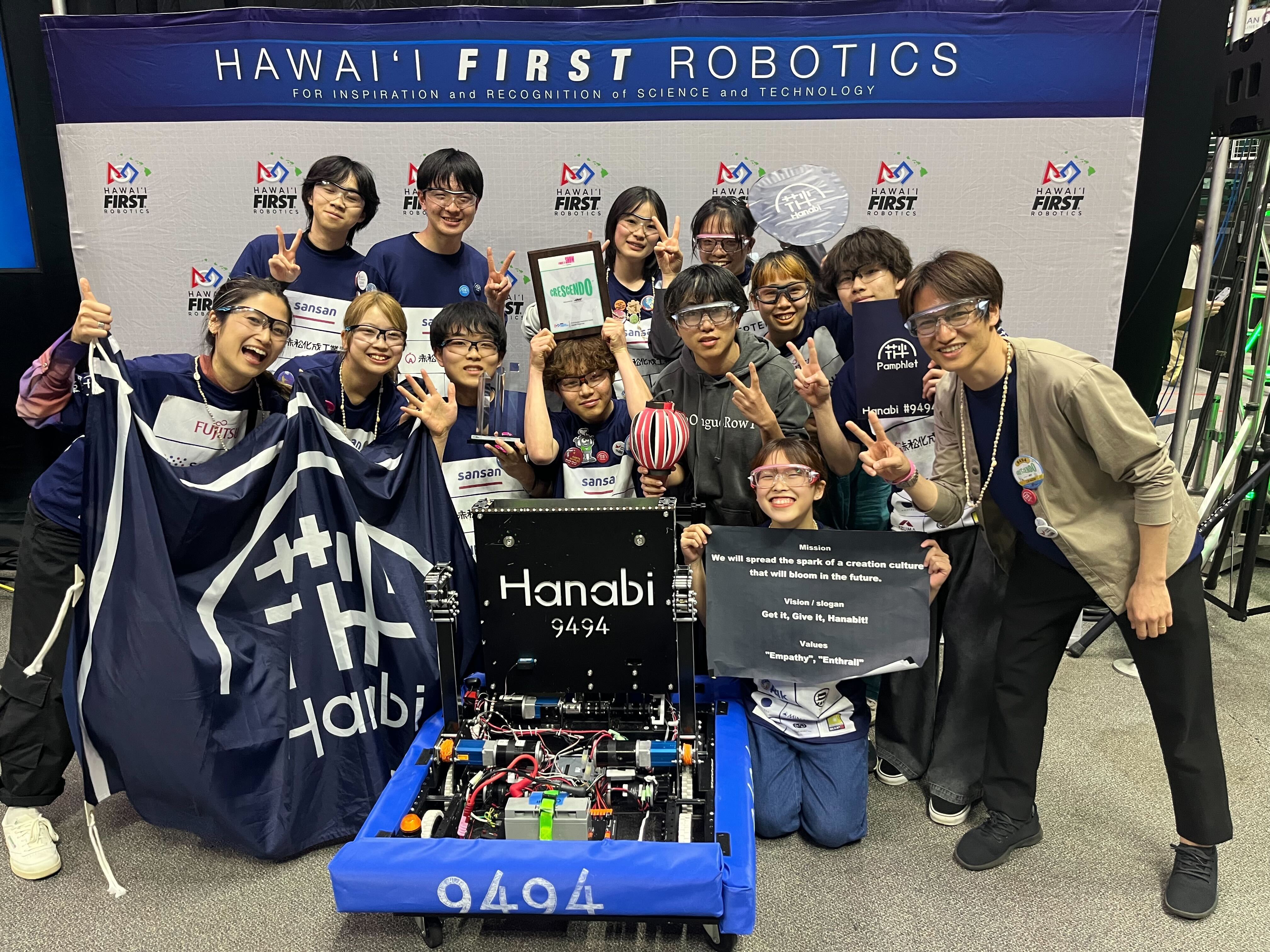Hanabiとは昨年6月に神山まるごと高専で結成されたチームです。一年生二年生合わせて27名で活動しています。昨年はハワイ地区大会に出場し、Rookie inspiration Awardと呼ばれる新人賞を受賞しました。