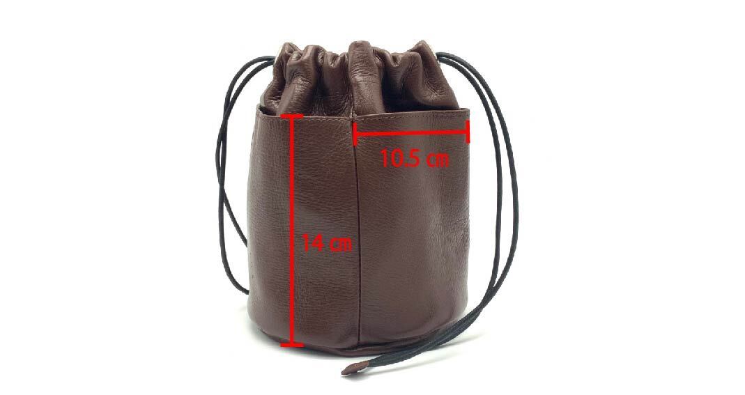 ちょっとそこまで外出するだけでも、必須アイテムは意外と多い。この本革巾着ショルダーなら、14㎝の底が厚みのある荷物もしっかり収納。