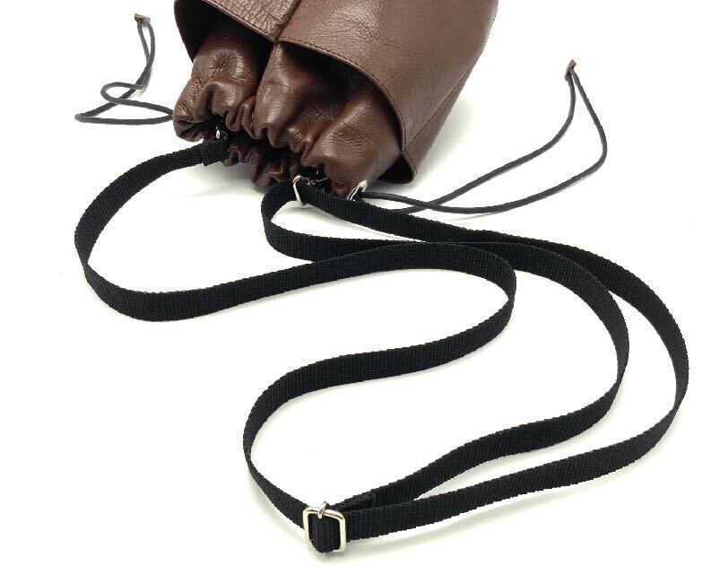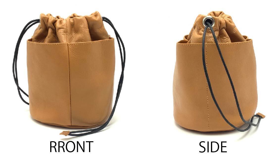 この巾着バッグなら、直径約14㎝の底がしっかり荷物を収納します。そして、ちょっと個性的な巾着をデッドストック革だからこそ気軽に楽しんで頂きたいと思います。