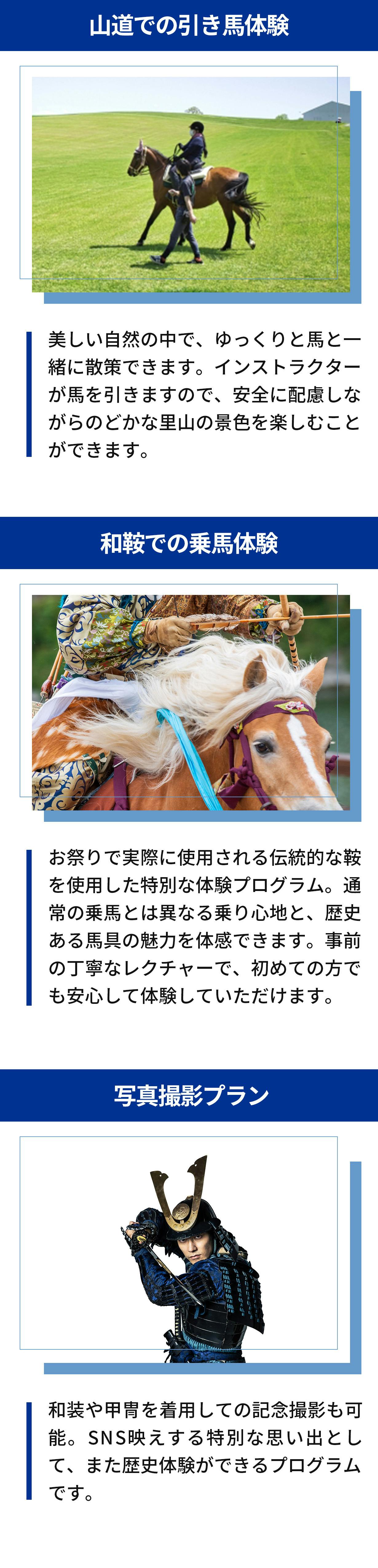 お祭りで実際に使用される装備を身につけ、 歴史ある馬文化を体験できる、他にはない特別なプログラムです。