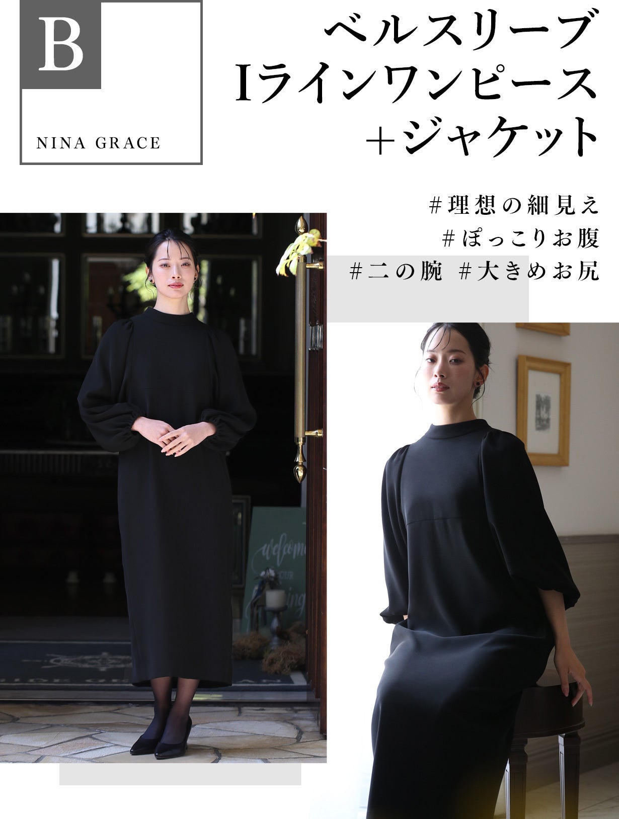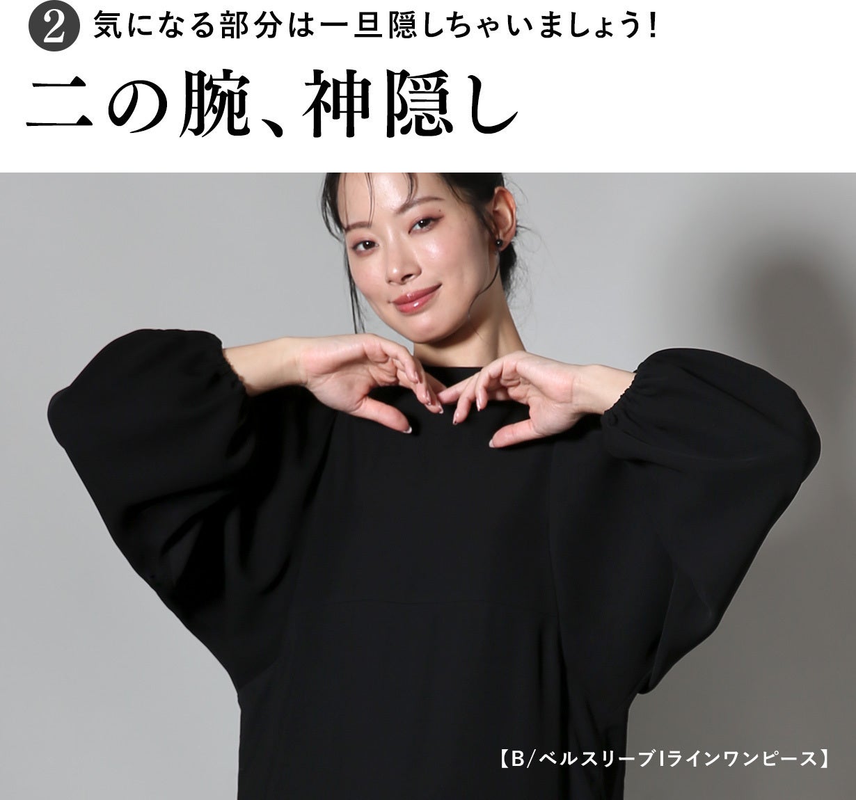 二の腕が気になる方におすすめのベルスリーブワンピース+ジャケット。ふっくらとした袖との対比で、手首周りを細見せ。さらに横に広がりすぎないIラインシルエット&胸下のハイウエスト切り替えの相乗効果で脚を長く見せて、スタイルアップを叶えます。