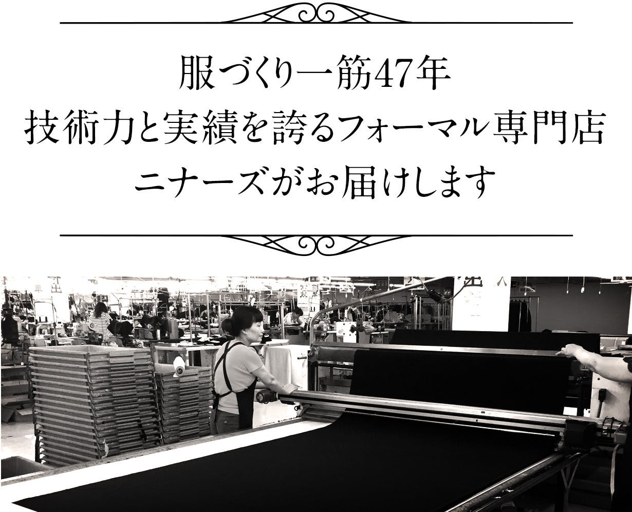 私たち株式会社NINAは、服づくり一筋47年の婦人フォーマル専門メーカーです。すべての女性に新たな価値とそれを手にする喜びをお届けすることを使命として、オリジナルブランド「nina’s」「NINA GRACE」を立ち上げ、伝統的なフォーマルウェアと現代のスタイルを融合したブラックフォーマルを作り続けてきました。