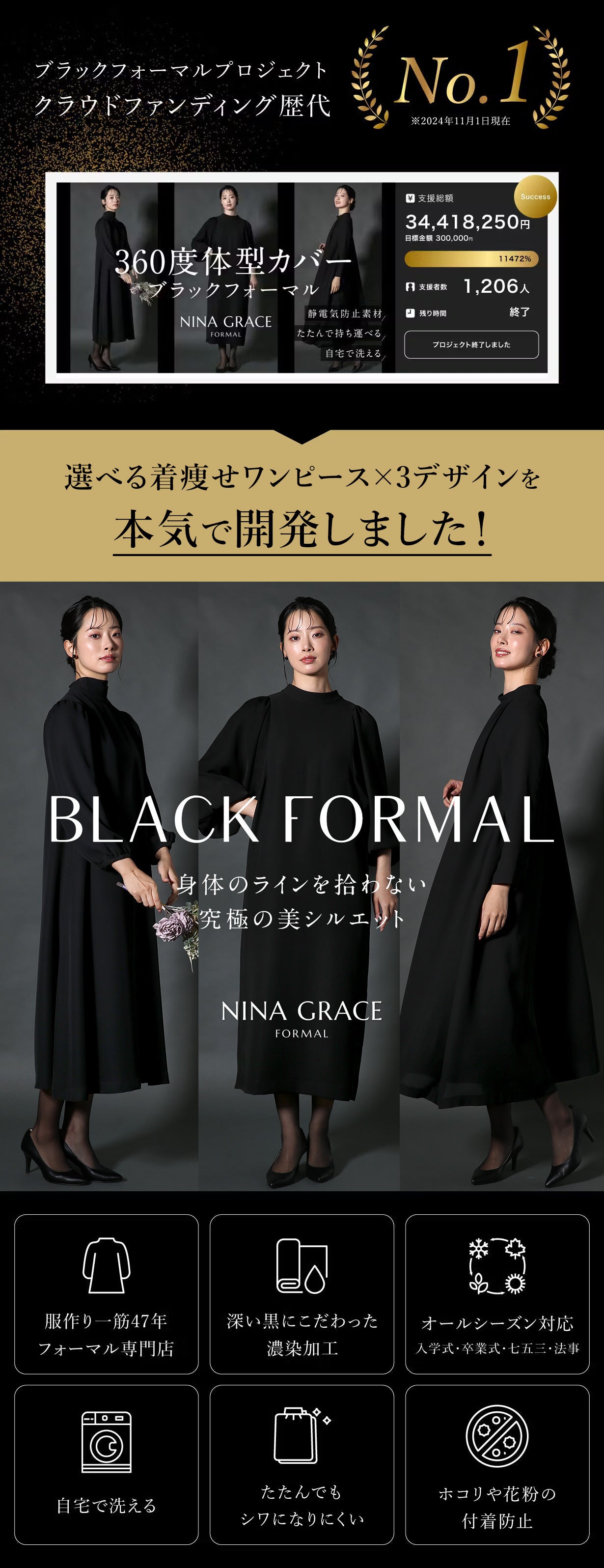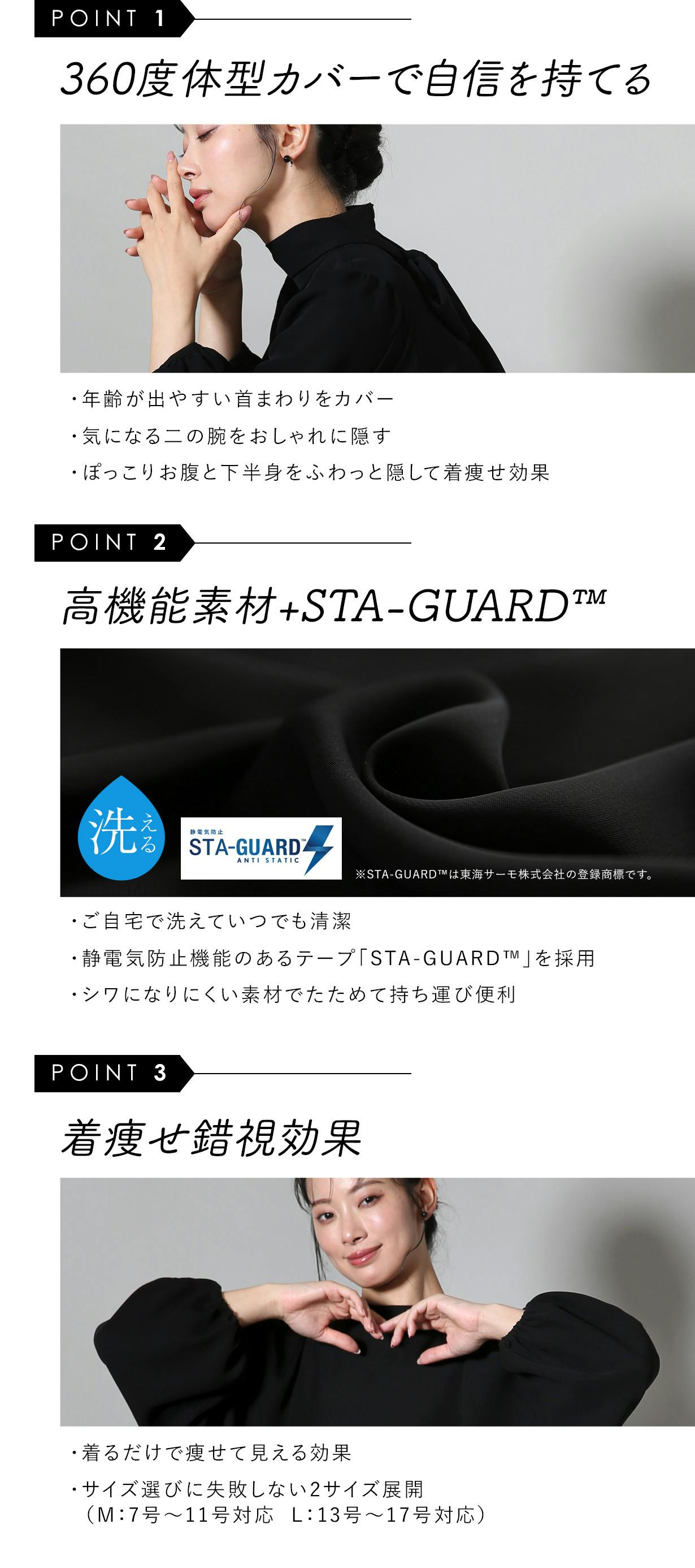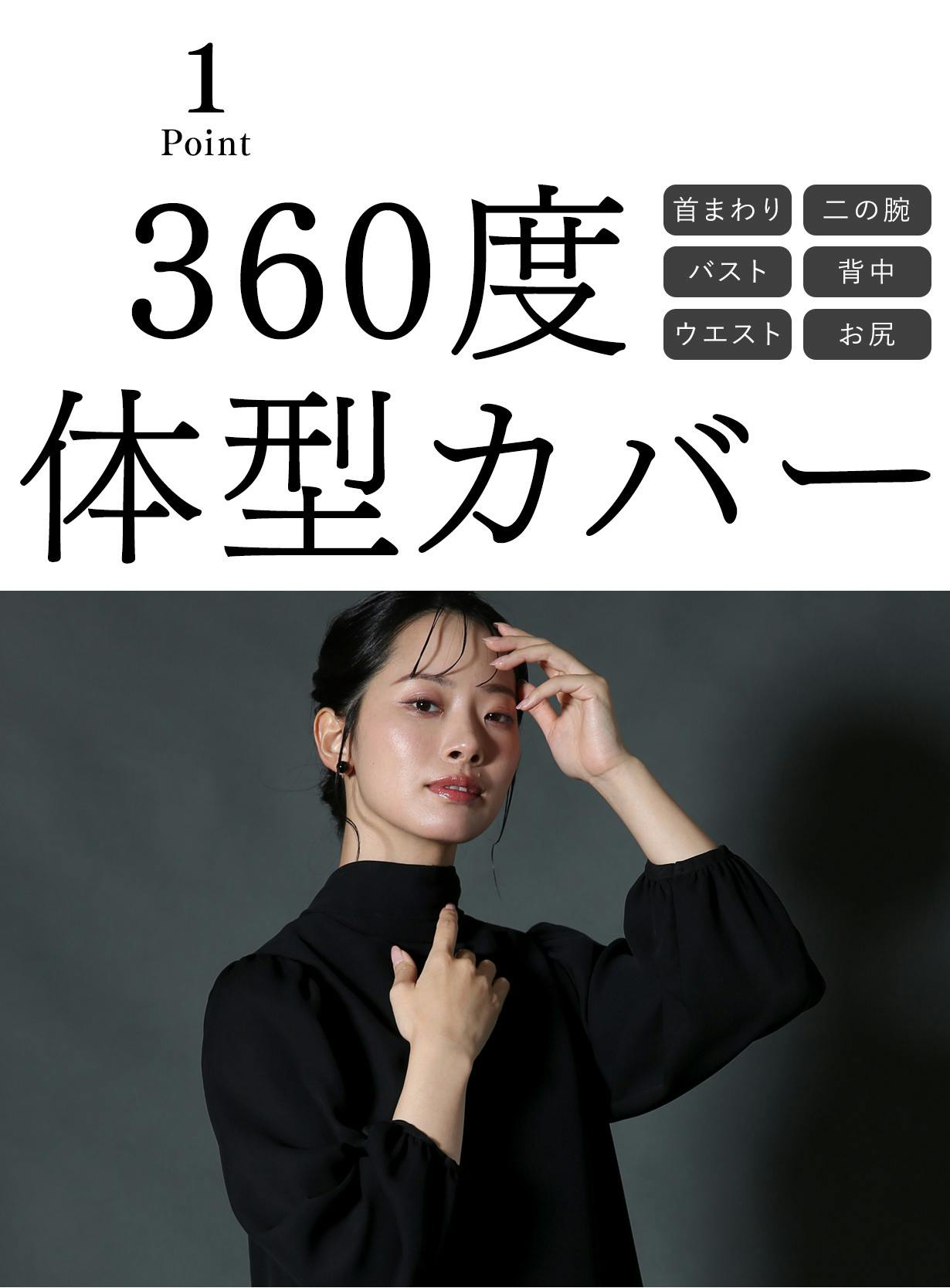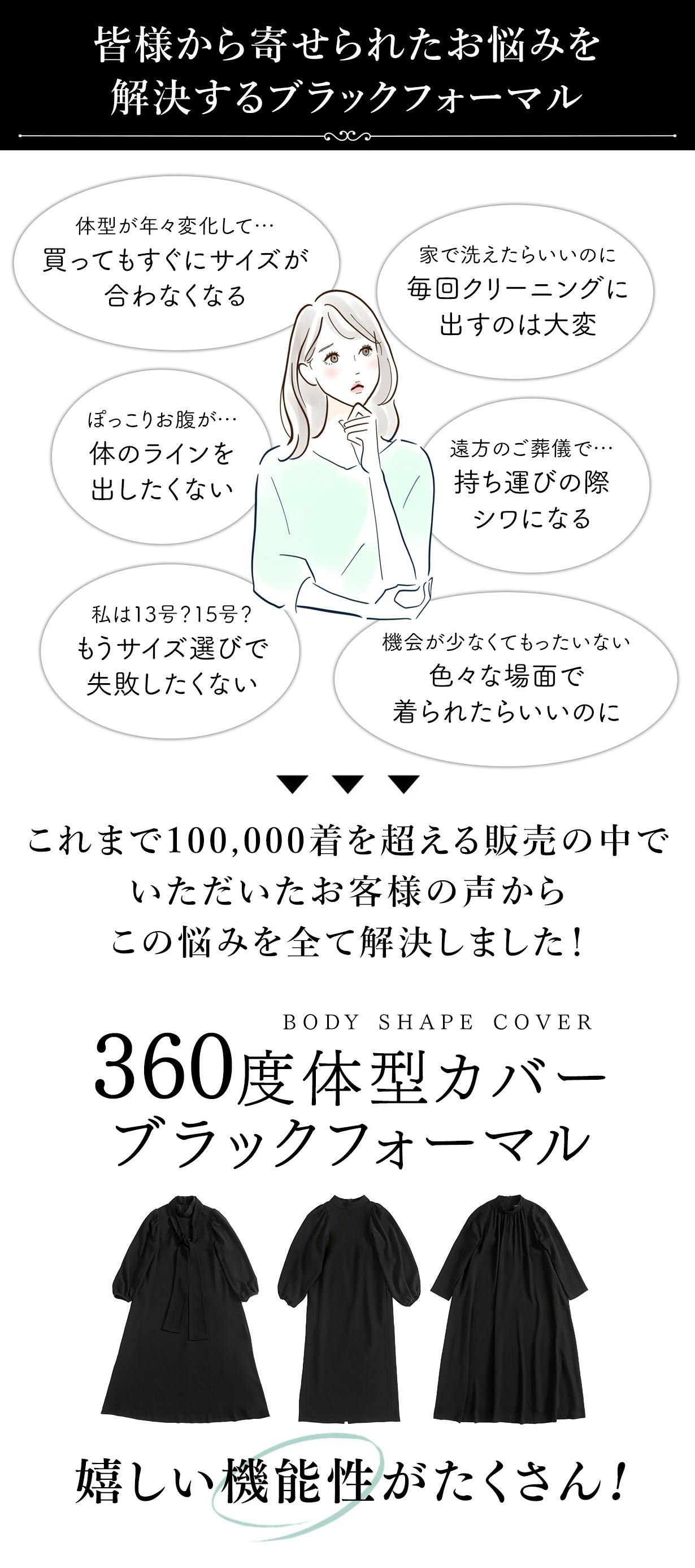 これまで10万着を超えるブラックフォーマルの販売を通して、多くお寄せいただいた「サイズ選びでの失敗」「数年ぶりに着た時の体型の変化」を最新技術のサイズレス構造と、身体のラインを拾わない美シルエットの追求で解決したのが、「360度体型カバーするブラックフォーマル」です。