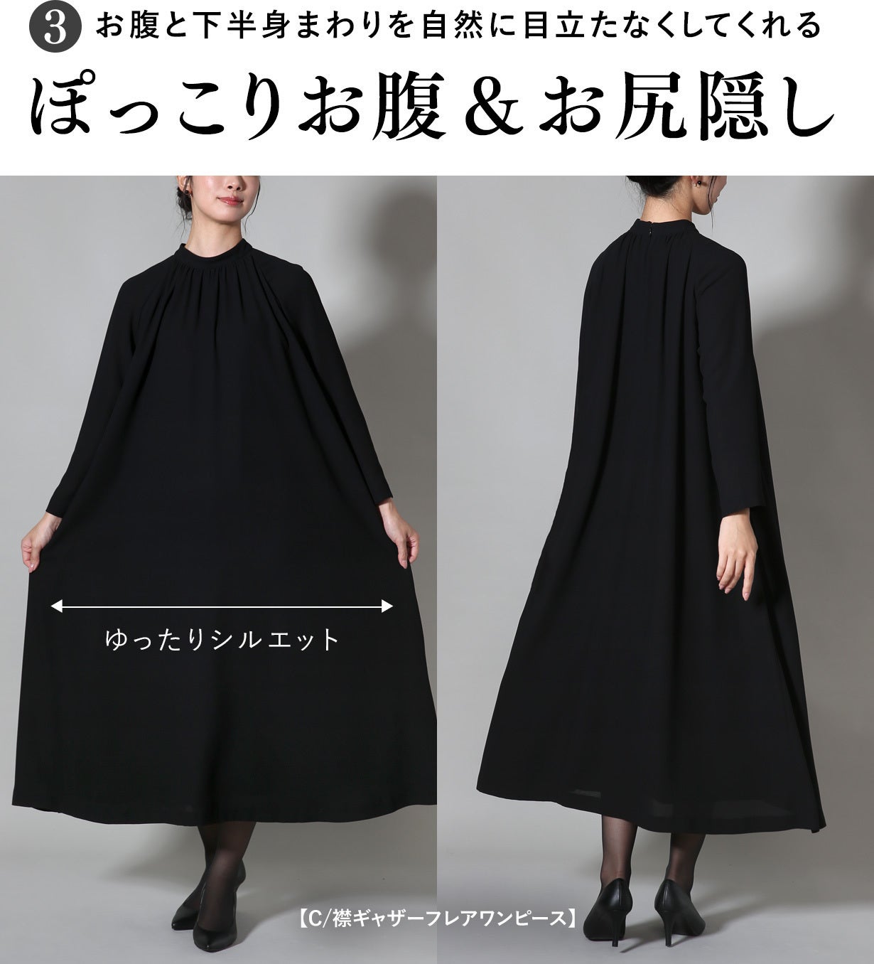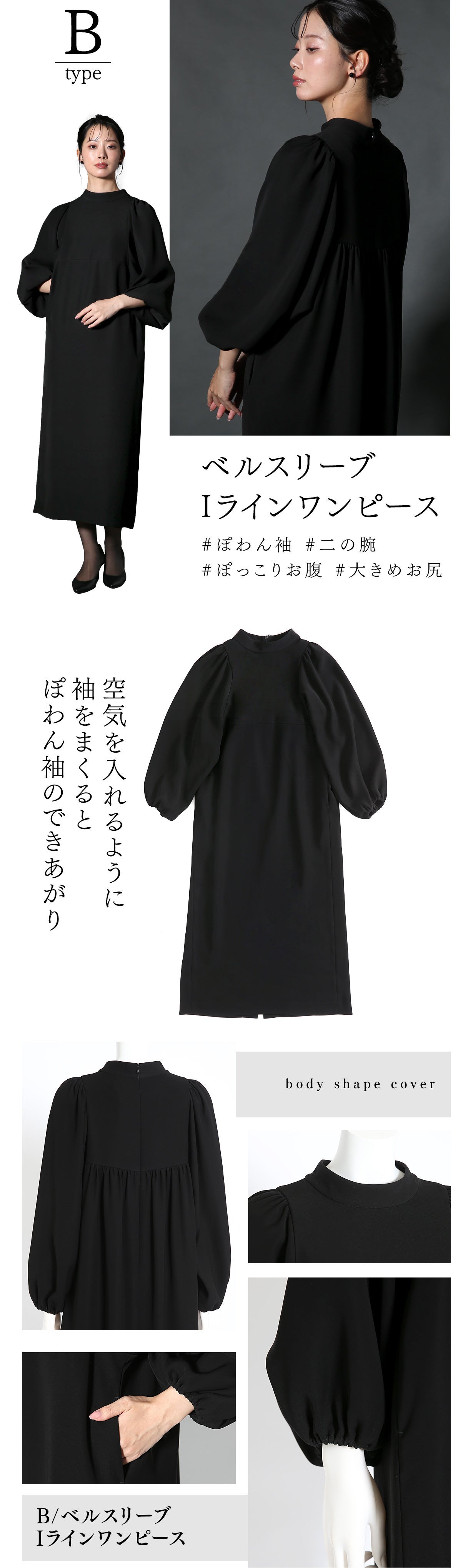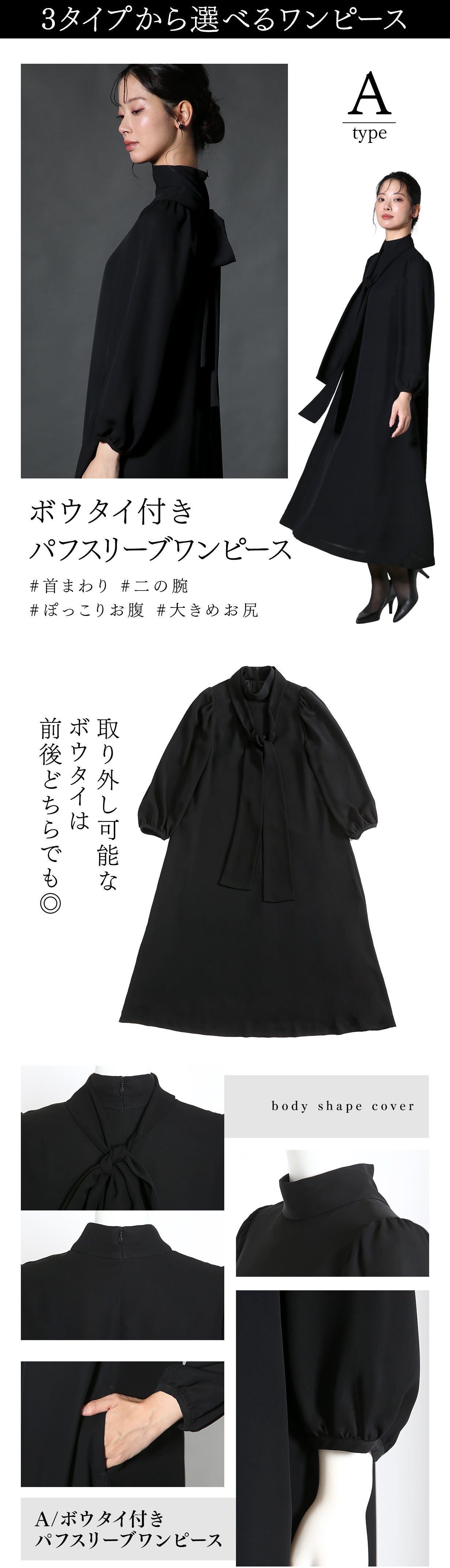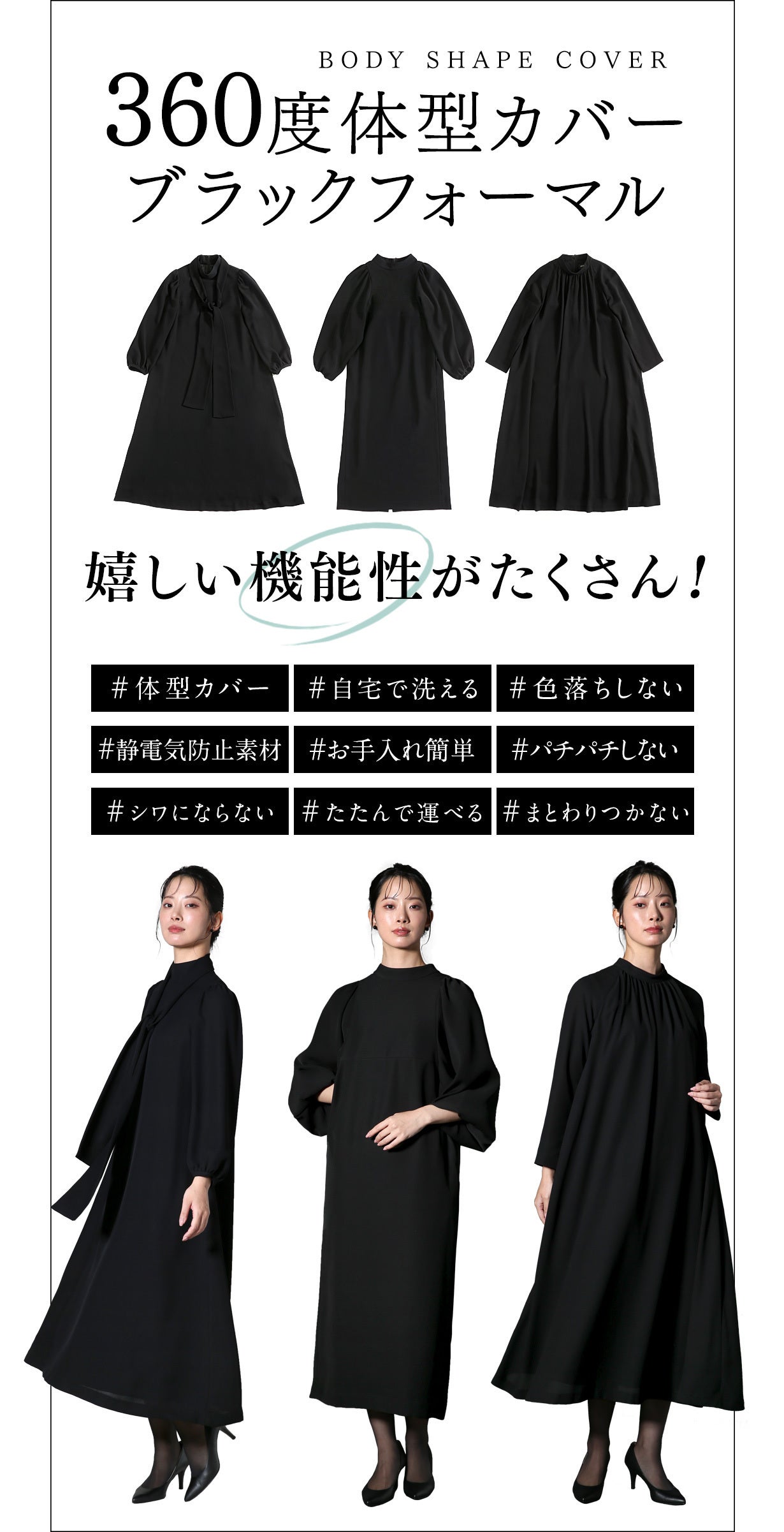 身体のラインを拾わない独自のパターン技術で誕生した「360度体型カバーするブラックフォーマル」は、1人ひとり異なる体型のお悩みに合わせて、ワンピースを3種類のデザインからお選びいただけます。