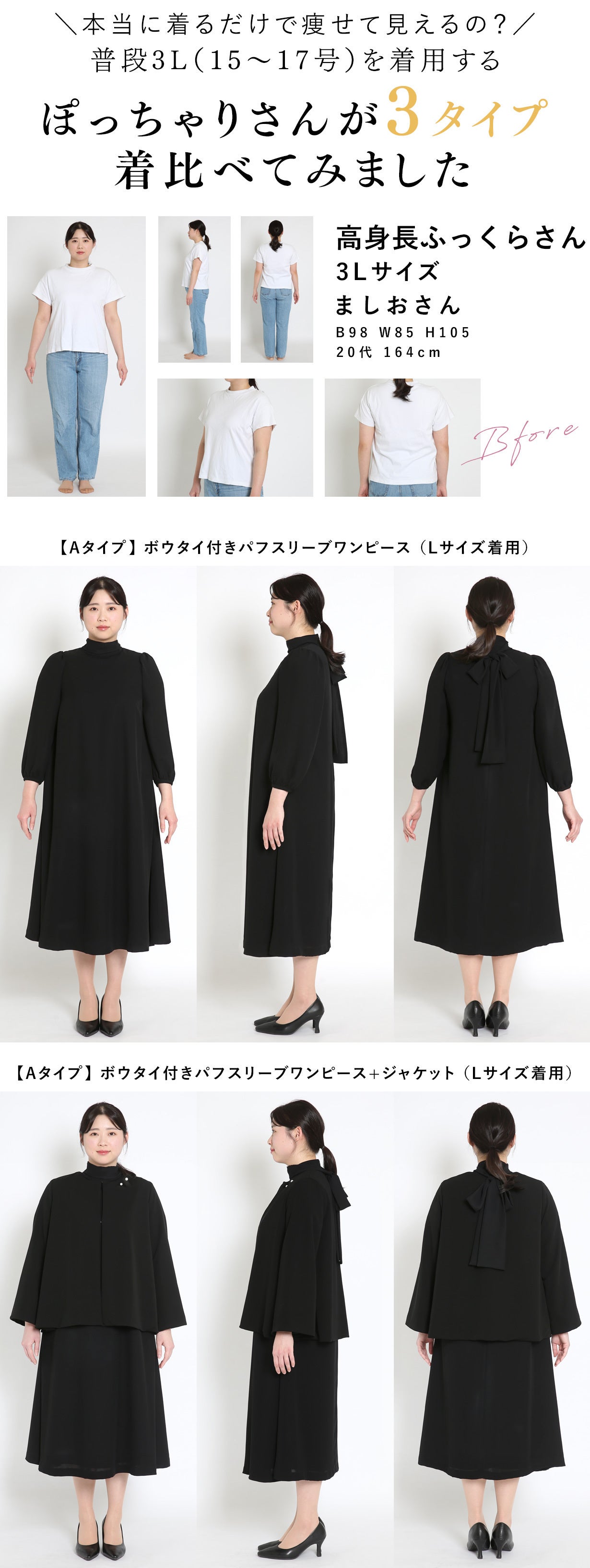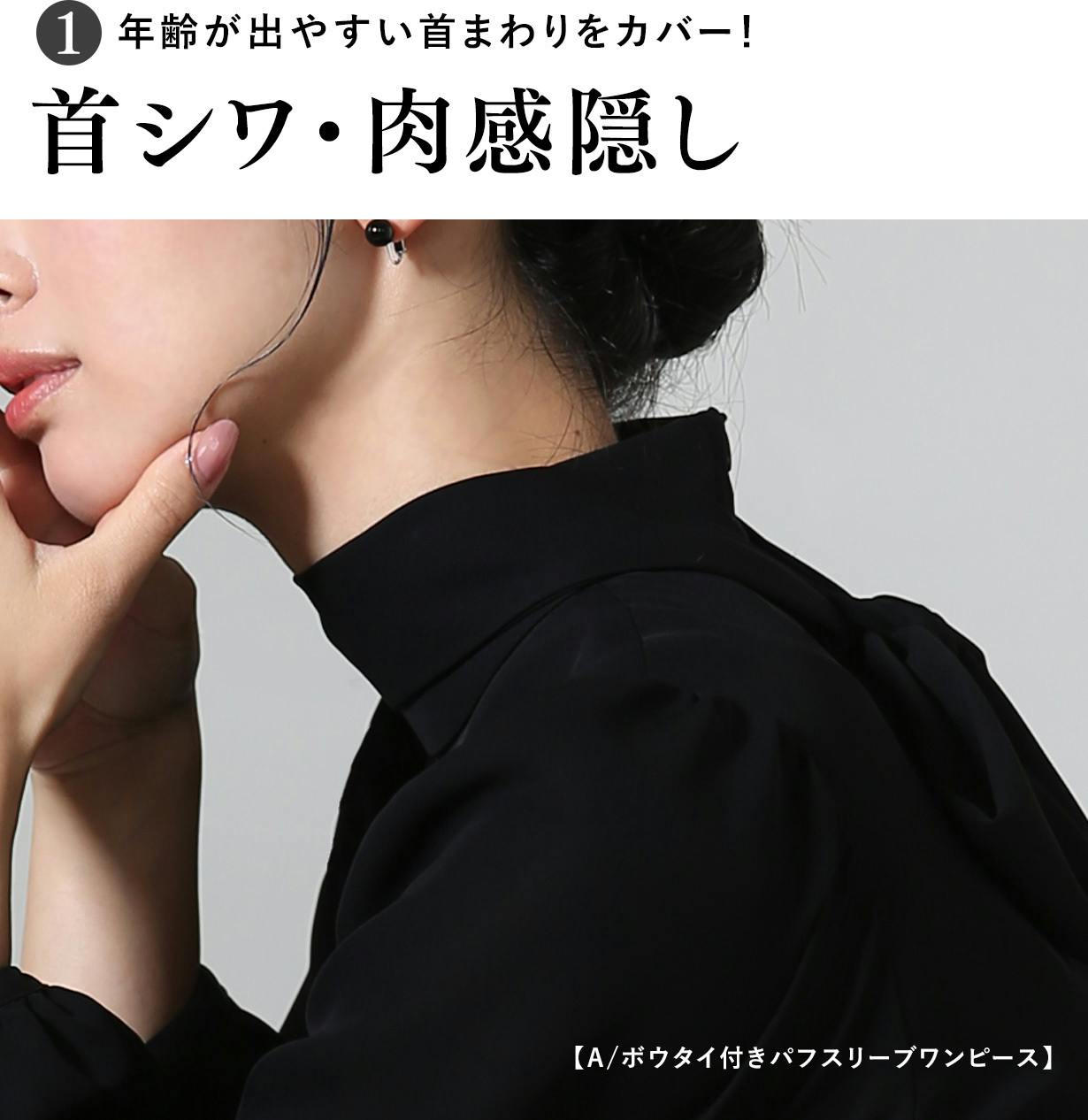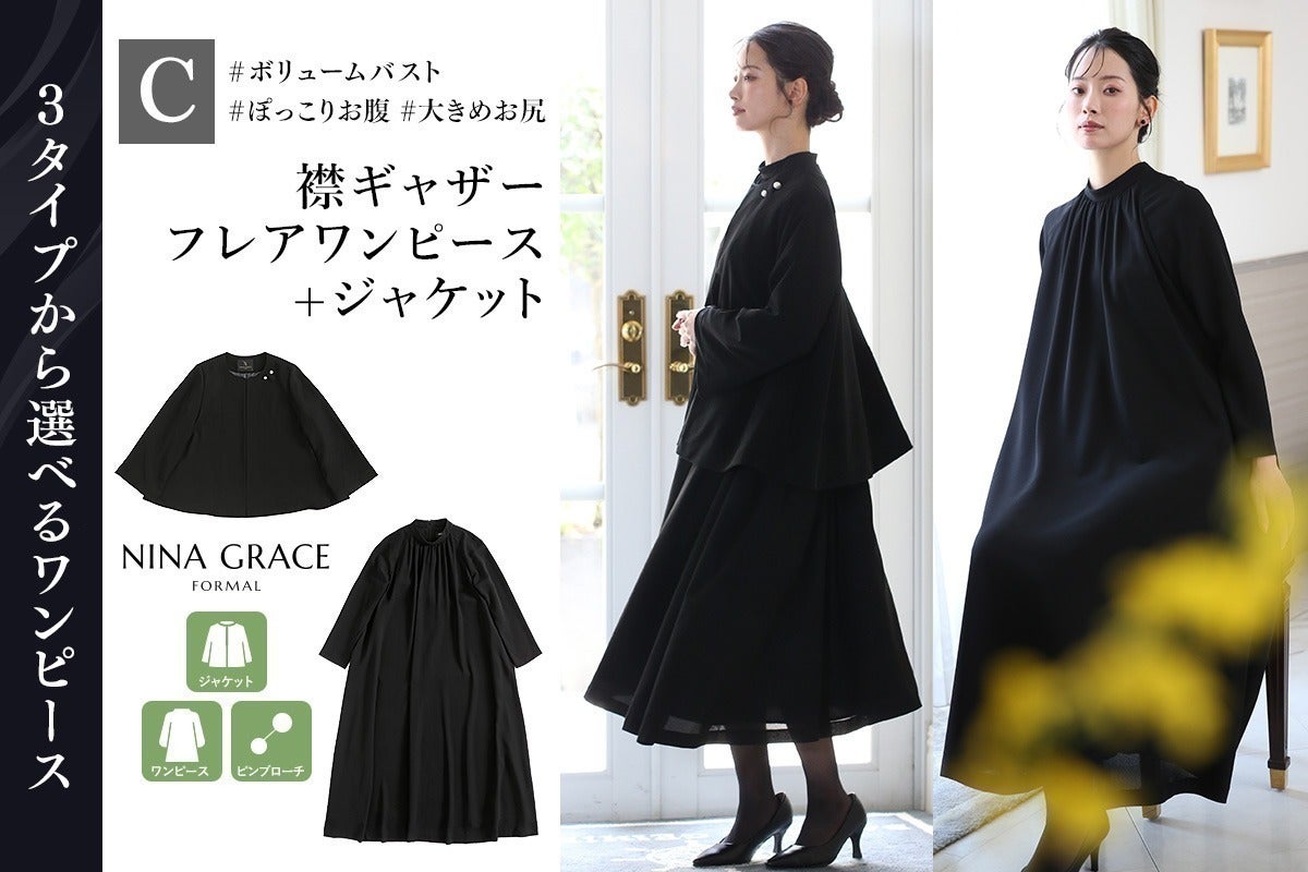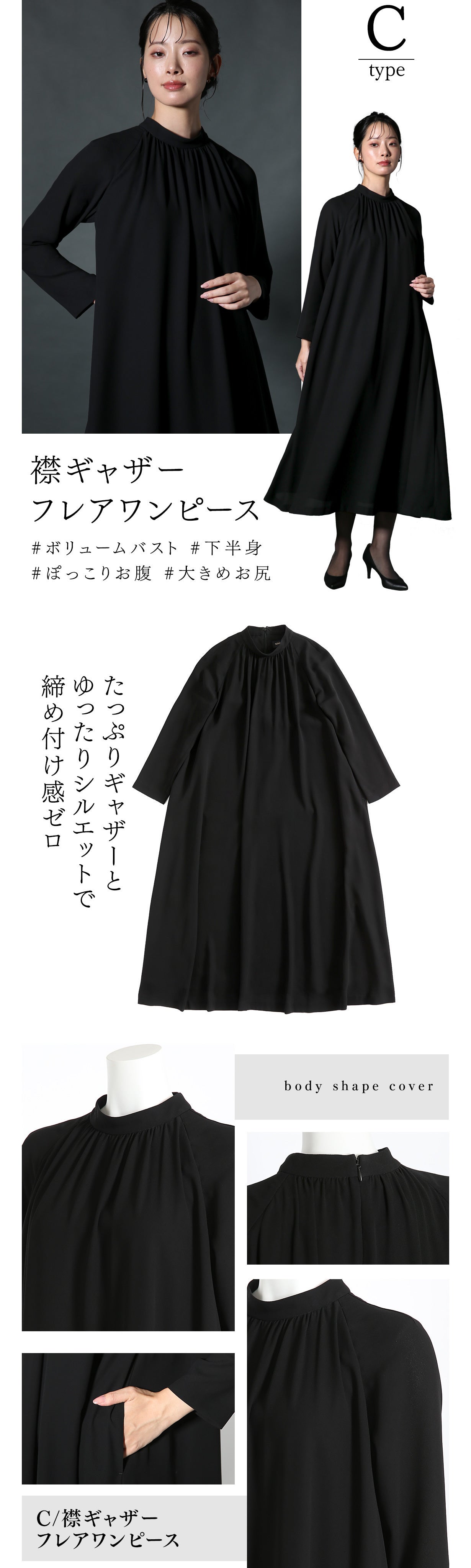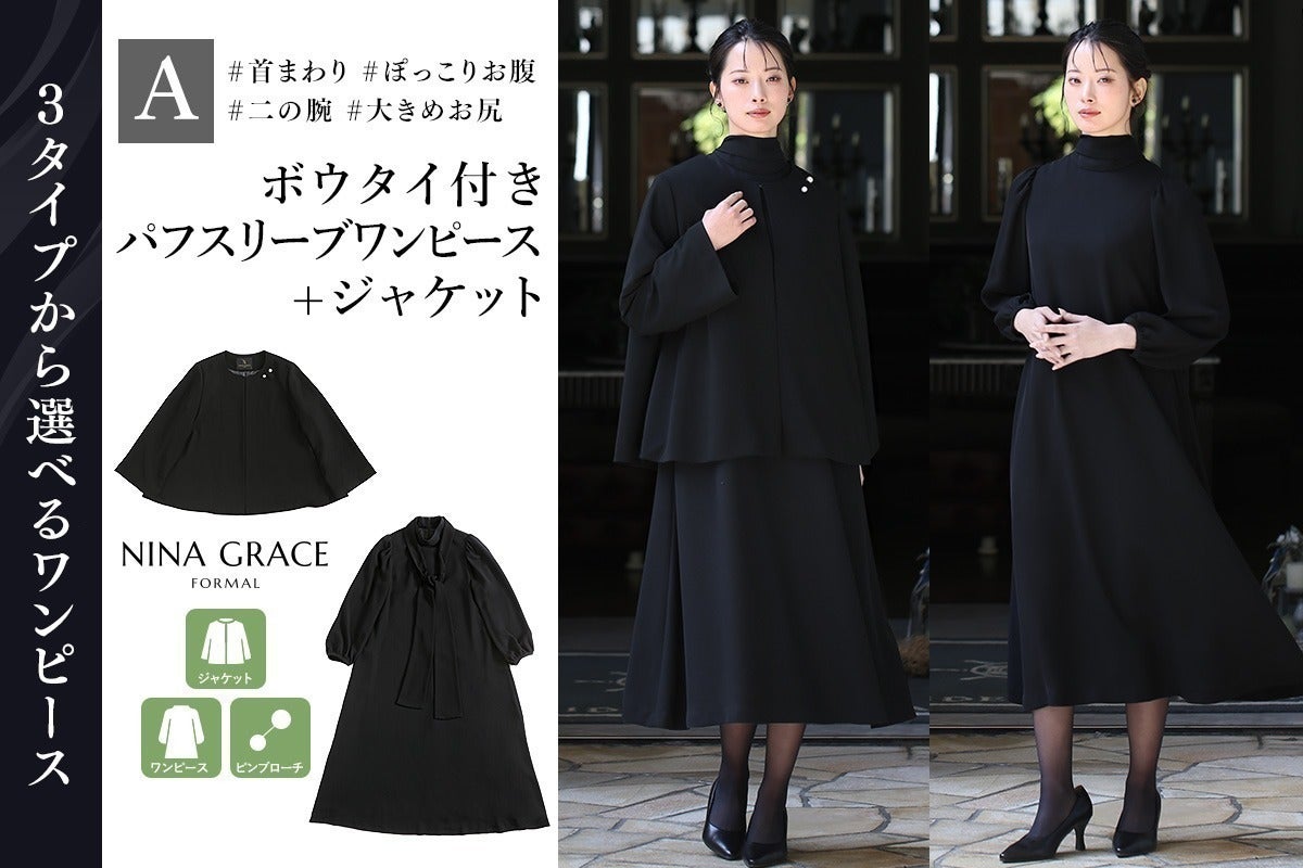 身体のラインを拾わない独自のパターン技術で誕生した「360度体型カバーするブラックフォーマル」は、1人ひとり異なる体型のお悩みに合わせて、ワンピースを3種類のデザインからお選びいただけます。