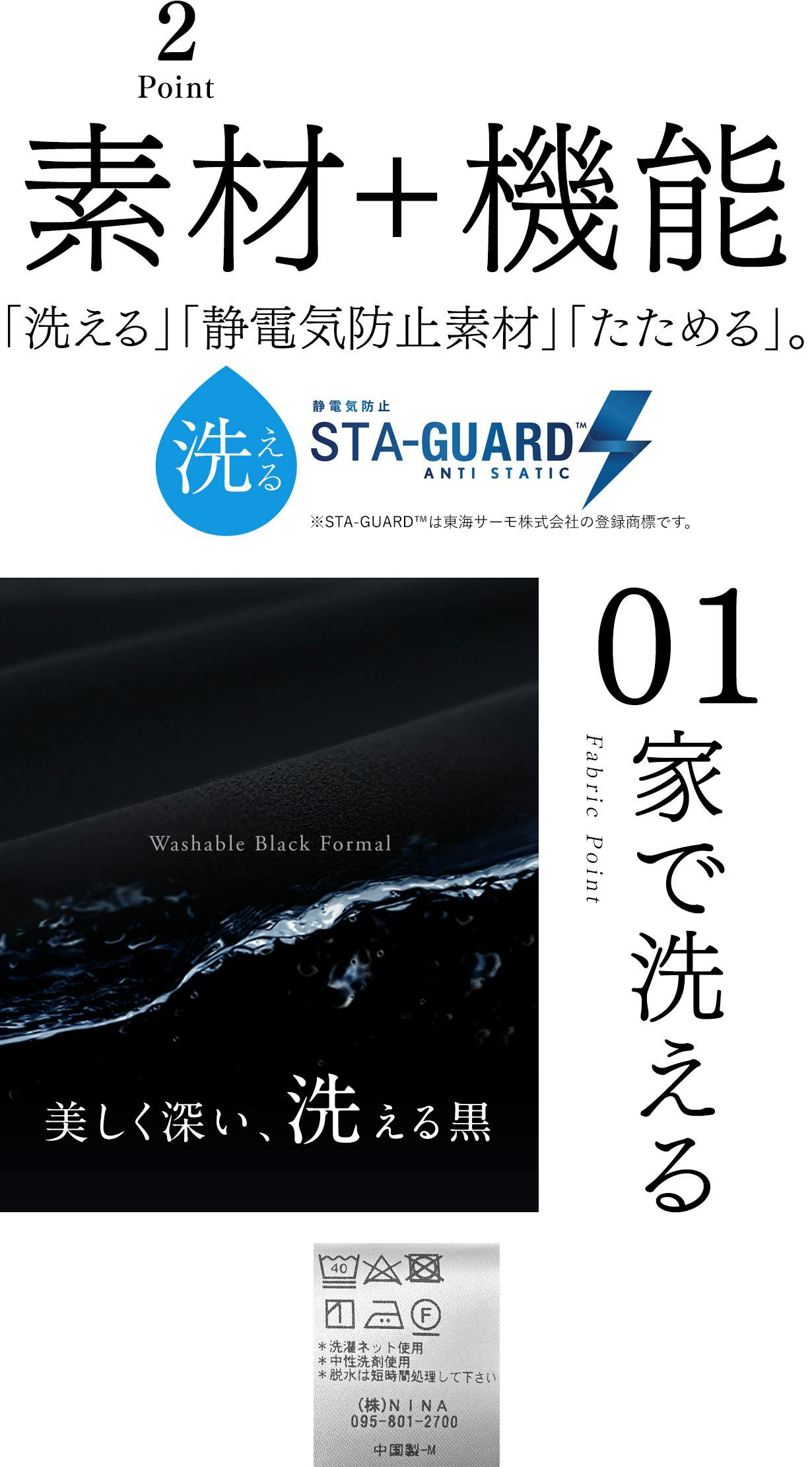ブラックフォーマルは「家で洗える」時代へ。明日・明後日に急に必要になった時も、着用した後も、さっと自宅で洗えていつでも清潔な着心地を叶えます。洗濯ネットをご使用いただければ「ご家庭にある洗濯機」で洗うことができて、洗濯後の縮みや色あせの心配もありません。