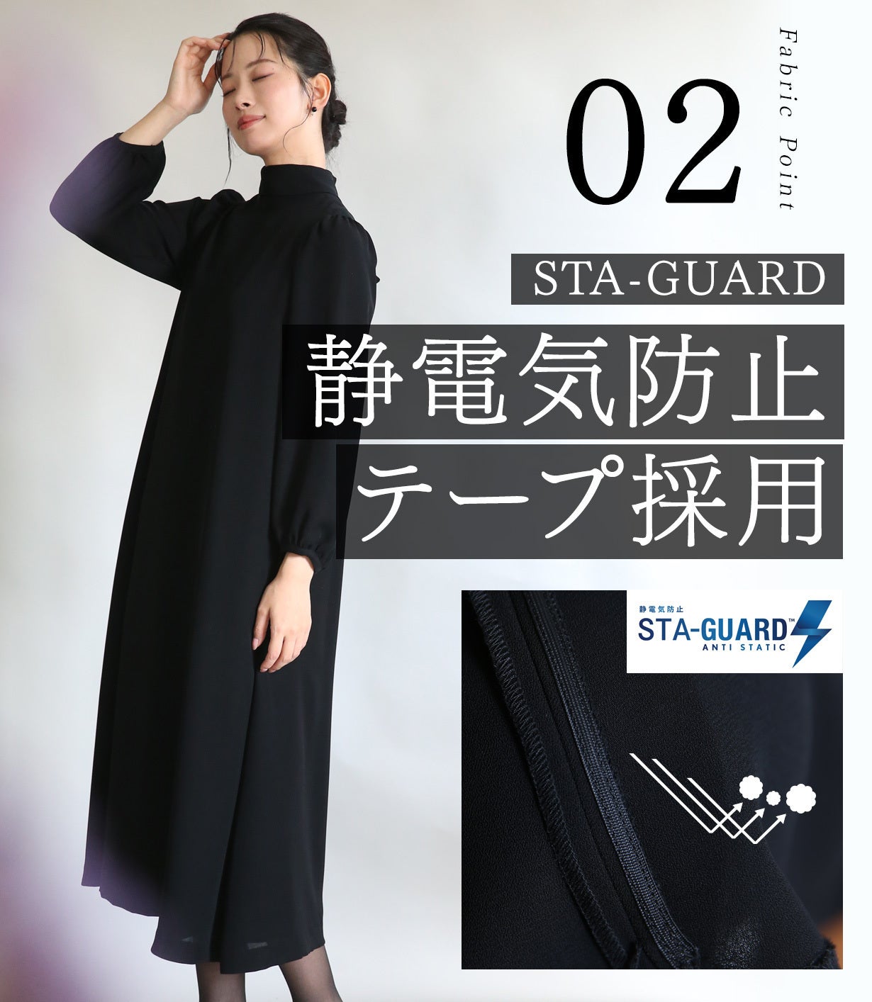 ワンピースの裾に特殊伝導糸100%の静電気防止スピンテープ「STA-GUARD™」を縫い付けています。着脱時のパチパチや脚へのまとわりつきも防ぎます。洗濯耐久性も抜群で、洗濯を繰り返しても長く効果が持続します。