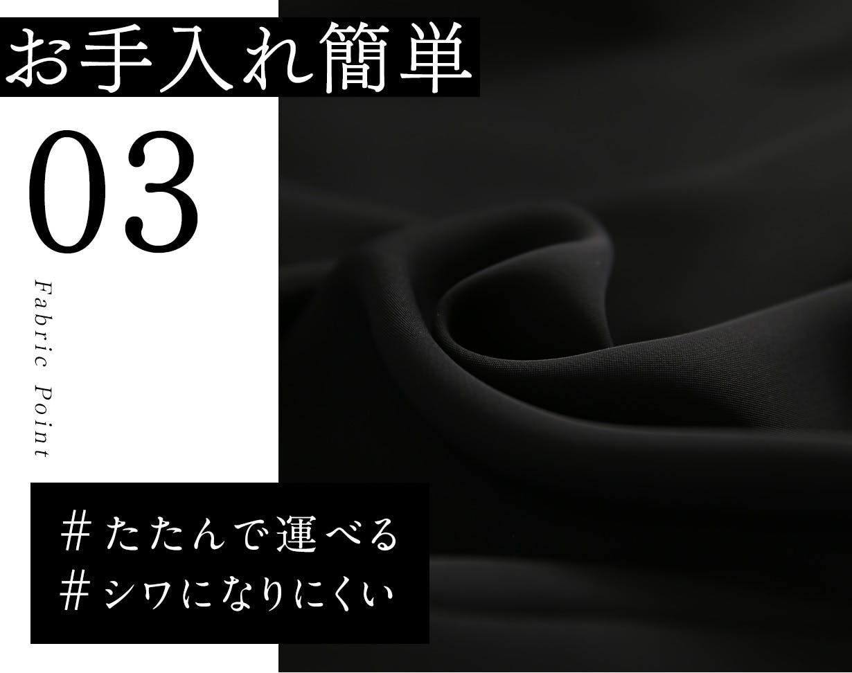 遠方のご葬儀への参列など、出先にブラックフォーマルを持ち運んで着替える際に厄介なのが「たたみジワ」でした。本商品はシワになりにくい素材を使用しており、小さくたたんで持ち運んでもアイロン不要でそのままご着用いただけます。
