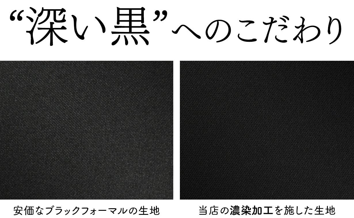 ブラックフォーマルの真価を決めるのは「黒」の発色です。生地目がしっかりと詰まった滑らかな“深い黒”は、凜とした高級感ある佇まいを生み出します。安価なスーツと並び立った時に「黒」の差がそのまま格の違いとなって表れます。
