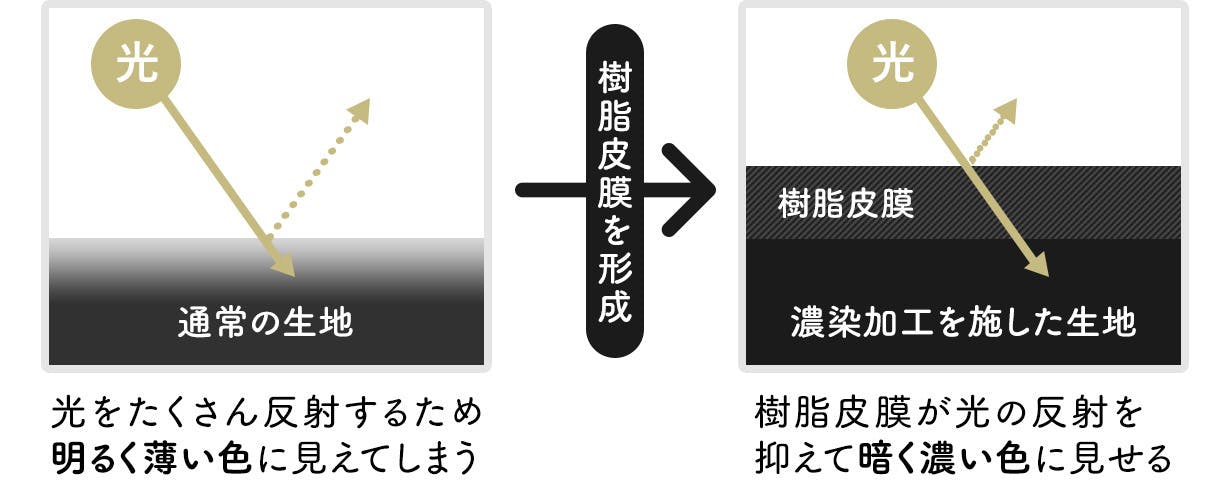 紺商品は特殊な分散染料を用いて繰り返し丹念に染めた生地表面に、屈折率の低い樹脂皮膜を形成する濃染加工を施しています。樹脂皮膜が繊維への光の透過率を上げて正反射を抑えることで、濃く深みのある美しい「黒」を実現しています。