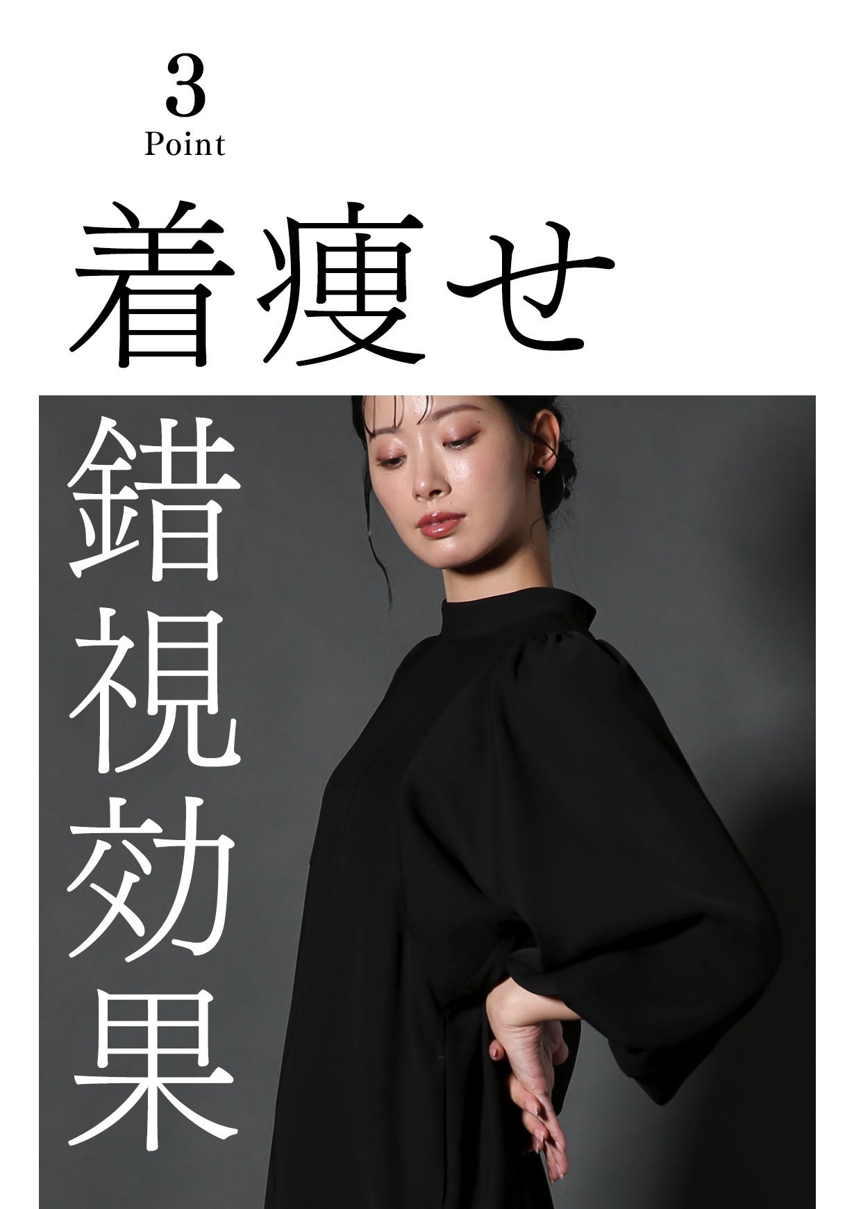 ボウタイを外して着た時も、首に沿って立ち上がるハイネックが露出を抑えてくれるので上品な印象に。お腹やお尻のラインを拾わずストンと落ちるシルエットは細見えしてくれます。