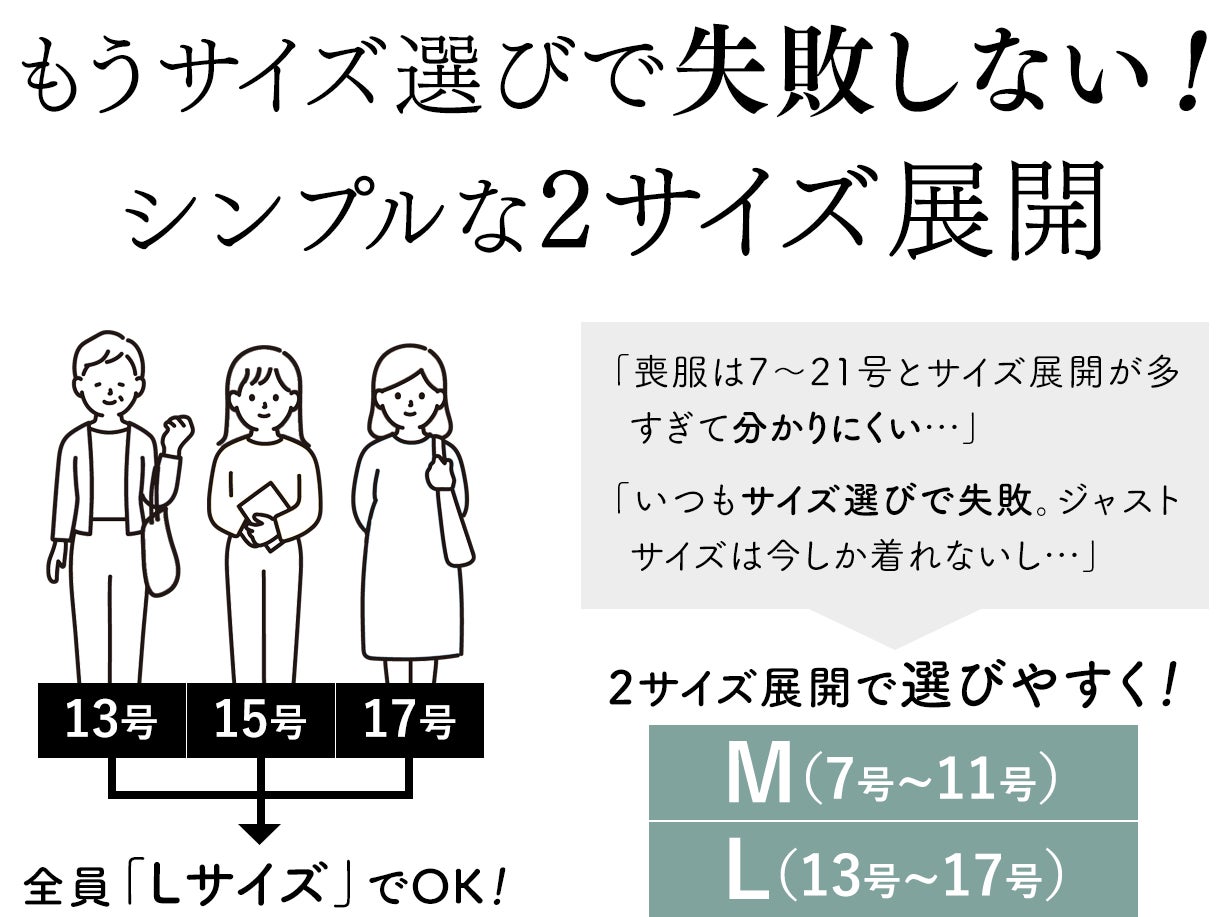 幾度にも渡る試作の結果、身体のラインを拾わず、かつ美しいシルエットを出すことに成功しました。1サイズあたりの許容範囲が広いため、業界でも珍しいM・Lのシンプルな2サイズ展開で「今だけではなく、この先もずっと美しく着られるブラックフォーマル」が完成しました。ブラックフォーマルは決して安い買い物ではないからこそ、「サイズ選びの失敗」「終わらない買い換え」に終止符を打ち、皆様にお手にとっていただける一着ができたと自負しています。