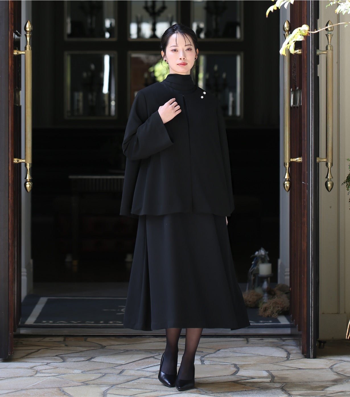 ご自宅で洗濯が可能な、1年を通して着られるブラックフォーマル2点セットです。ジャケットはさらりと羽織れる、女性らしい着丈長めなボレロ風デザインです。