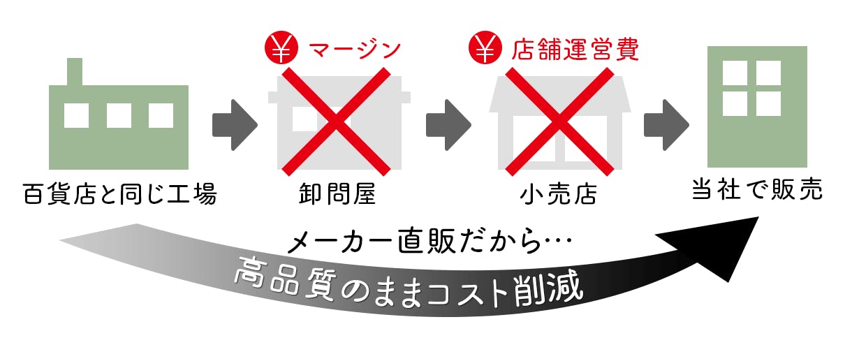 当社では商品の企画から製造・販売までを一貫して行うことにより、高品質とお求めやすい価格の両立を実現したSPA(Speciality store retailer of Private label Apparel)方式をとっています。商社や問屋、小売店に本来取られるマージンを削ることで、高い品質のまま手に取りやすい価格を実現しています。