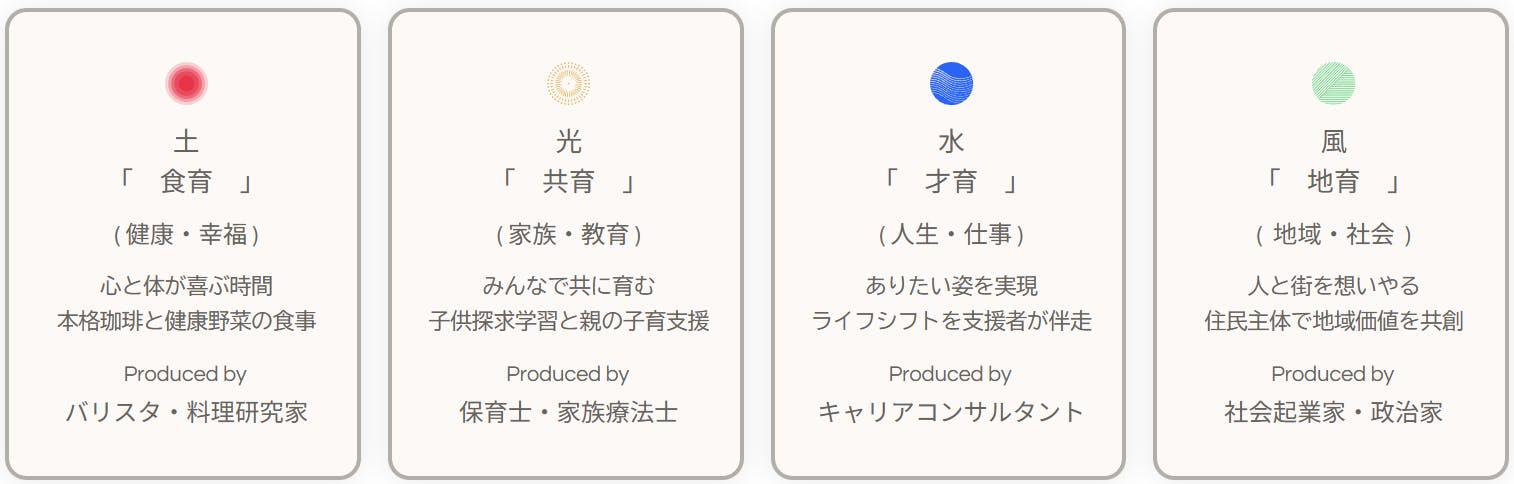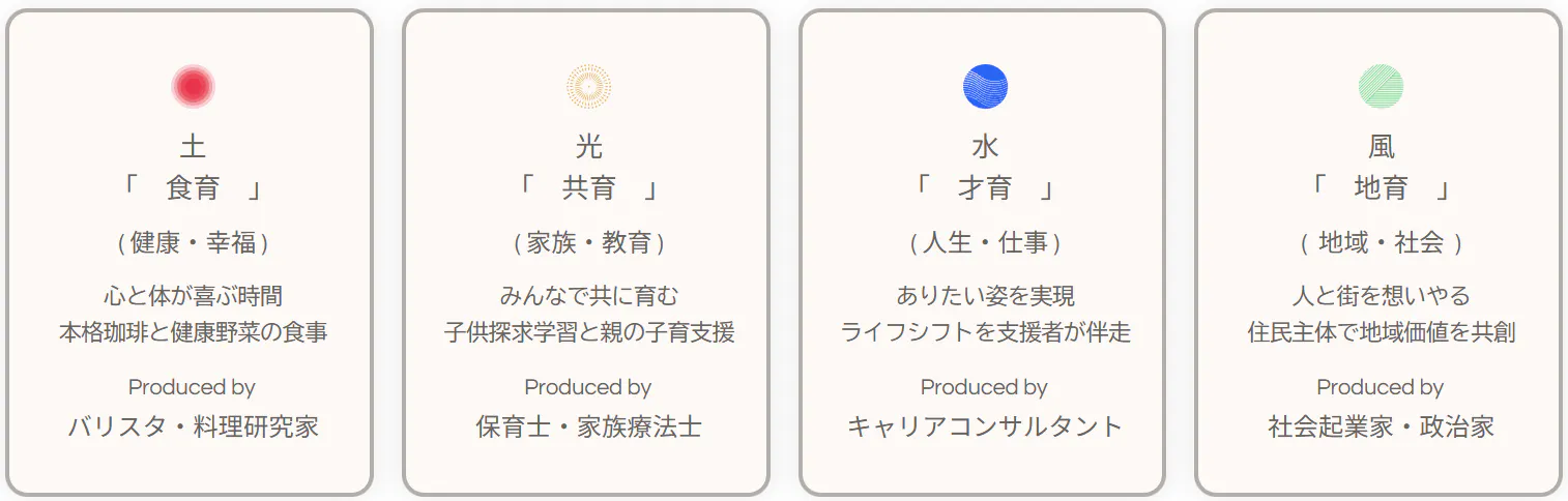 私たちは、土の「食育」、光の「共育」、水の「才育」、風の「地育」を提供しています。