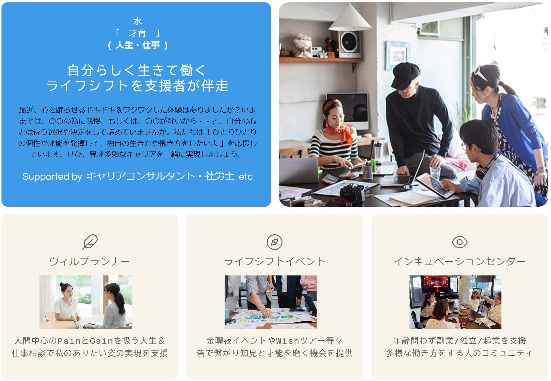 自分らしく生きて働くことを支援する「キャリアコンサルタント(国家資格)」を中心としたチームであり、保育士や社労士や弁護士や家族療法士や臨床心理士などの全国の専門家が集まって1つのチームを形成し、地域の人々の暮らしに深く根差して一緒に課題解決と価値共創を伴走支援できることが私たちの強みです。