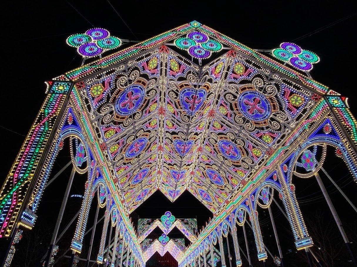 ルミナリエの光は、まるで異世界に迷い込んだかのような幻想的な雰囲気を醸し出します。緻密に設計された光のアーチや壁画のようなデザインは、昼間には見られない特別な神戸の夜を彩ります。