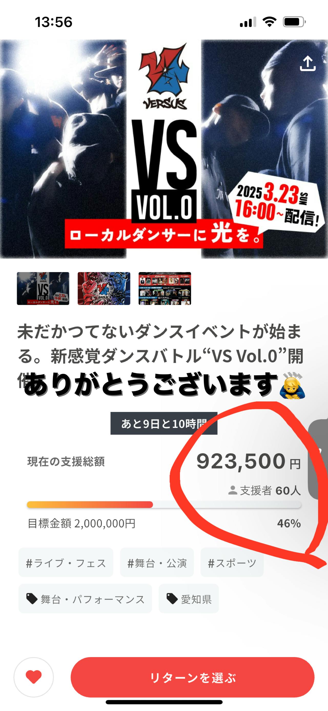 ※現在の支援総額 923,500円 支援者 60人 達成率 46%
