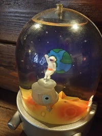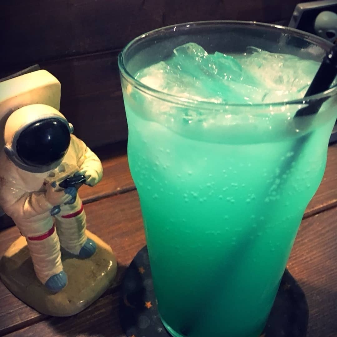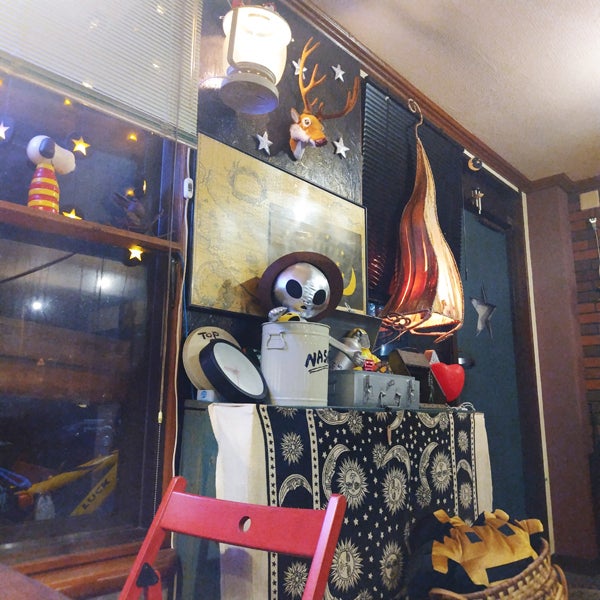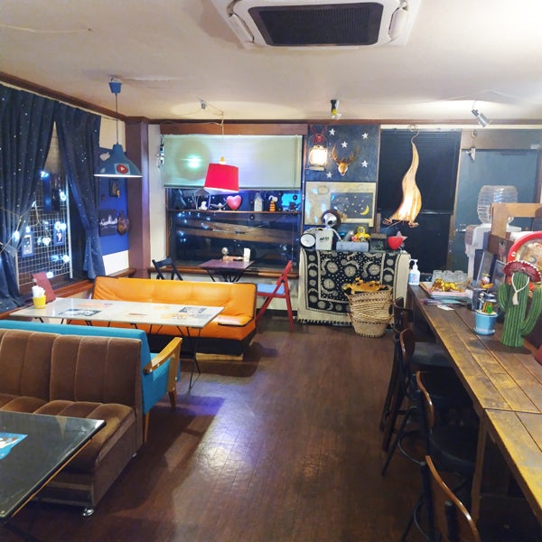 古いガレージ風に仕上げた店内のあちこちに宇宙要素をちりばめて