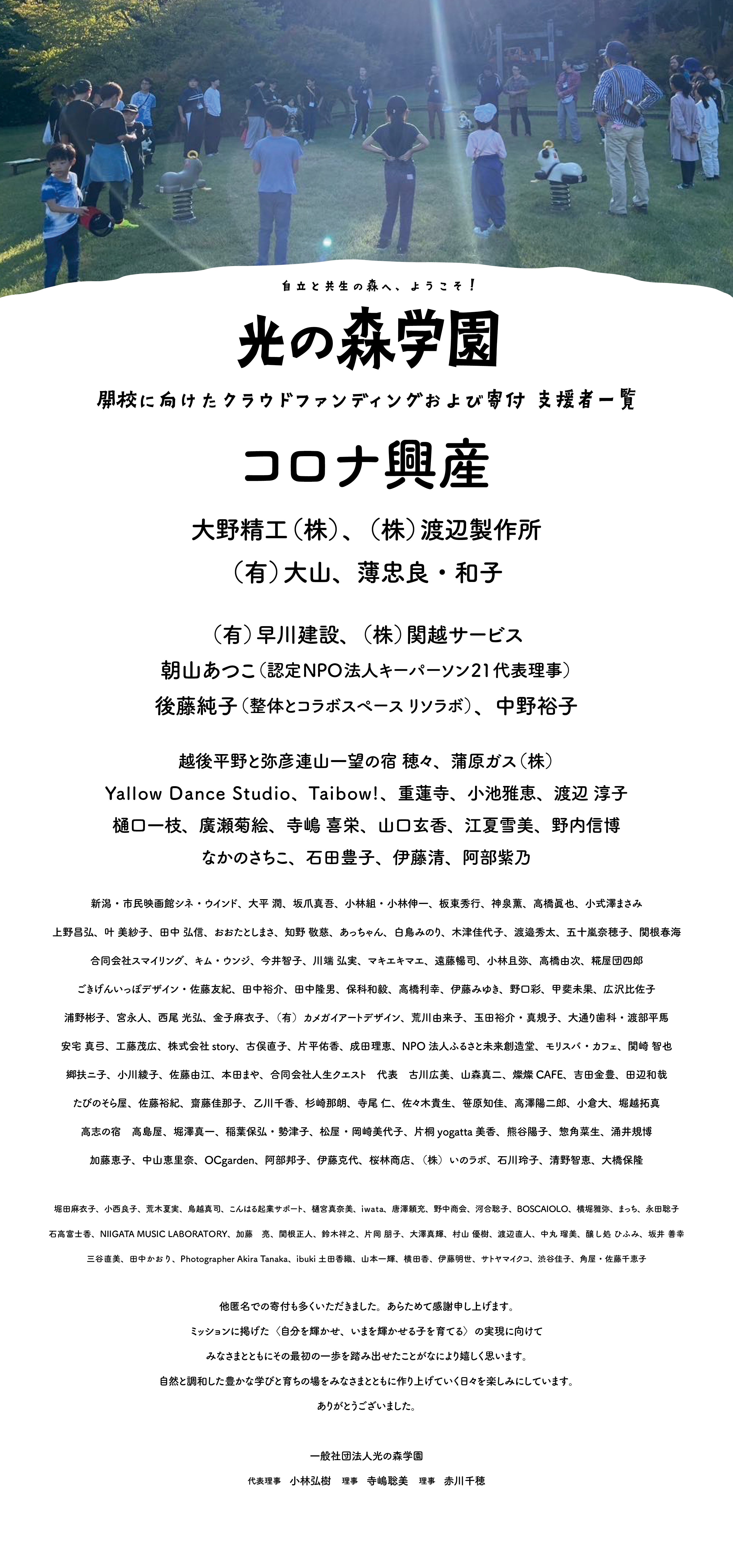 光の森学園開校に向けたクラウドファンディング支援者のみなさま。