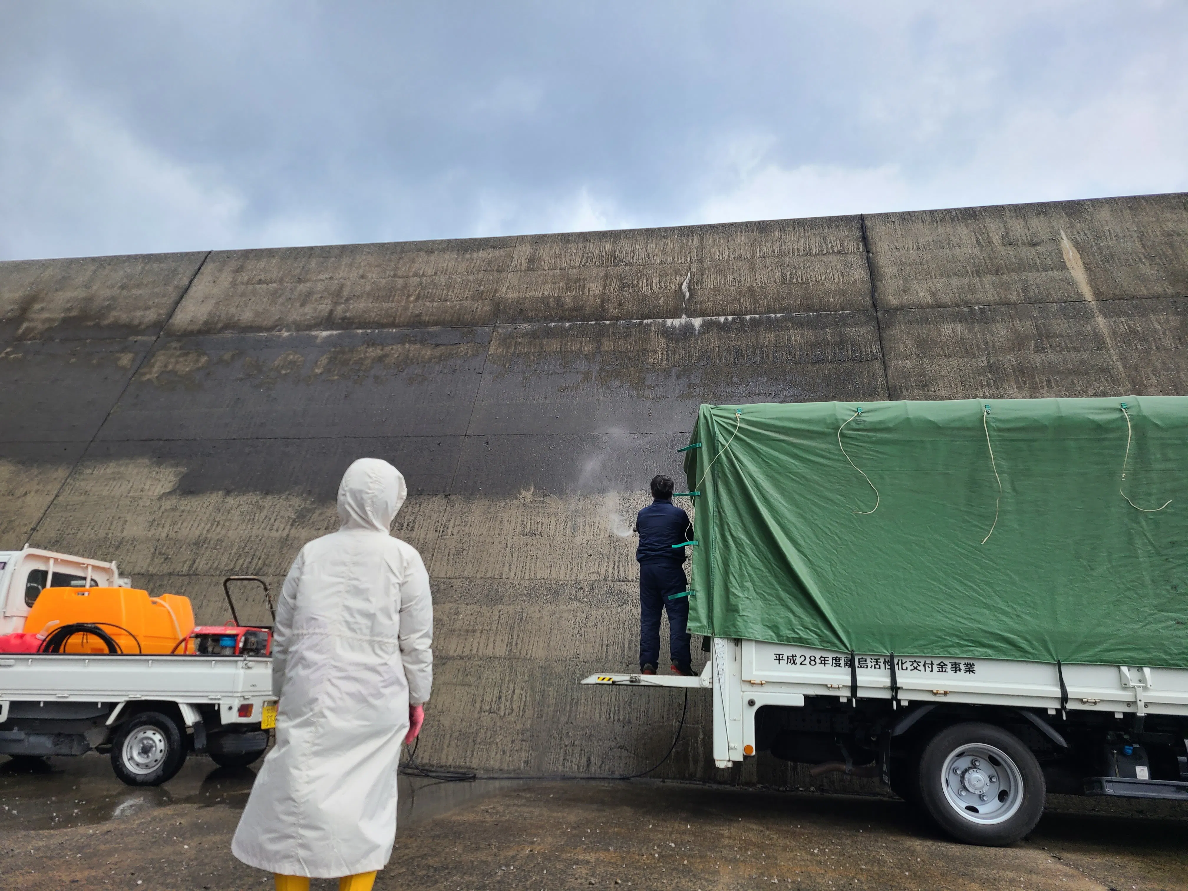 皆さん、クラファンに沢山のご支援ありがとうございます。本日は、第3回目となる壁の洗浄作業を行い、2m×60m部分が完了しました~!(でもまだまだ1/3ほど)17日(土)から行っている、洗浄作業ですが、やっている方は高圧洗浄機も使ったことのないど素人…スターターのかけかた、エアーの抜き方など、頼りになるプロジェクトメンバーはもちろんのこと、島の先輩方や業者の方々などが、声を掛けて手伝ってくださいます。困っていると、誰かが声を掛けてくれて、颯爽と助けてくれる。そしてそれをことさらに誇示するわけでもなく、あくまでも、いつもと変わらないスタンスで。そういうところが島人のかっこいいところで、壁画制作を通じて、島人のこういう、表には出てこないかっこよさを感じられるのが、このプロジェクトの醍醐味なのです!