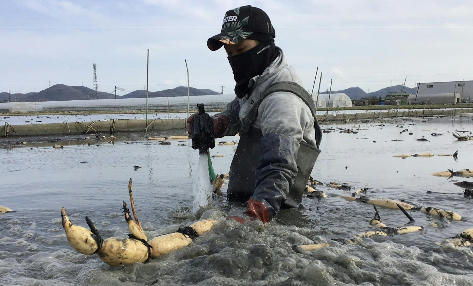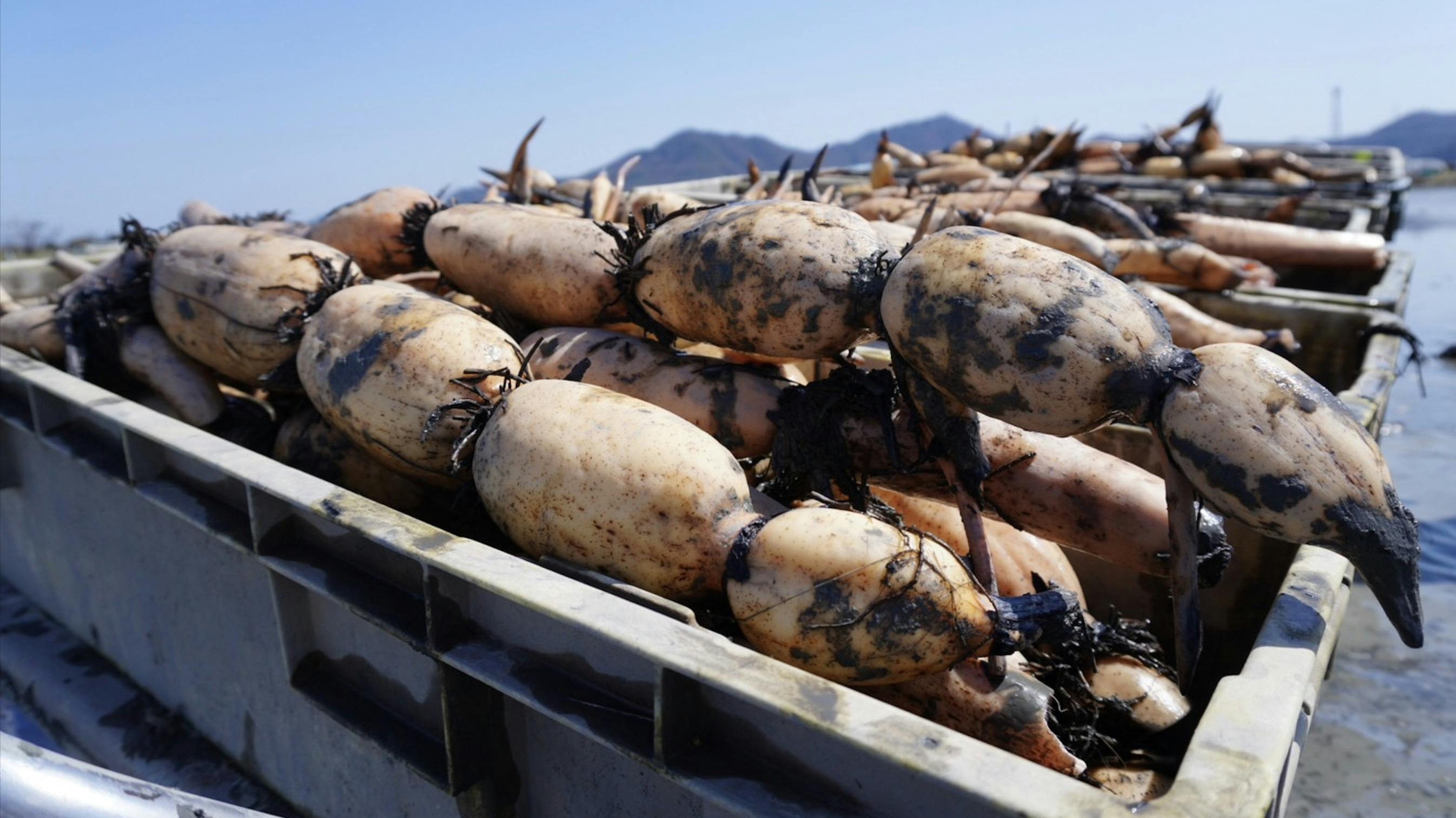 土質が良いと味も見た目も良い、美しいれんこんが育ちます。味と見た目がイマイチなものは、ぷつぷつとした肌質になったり、傷ができたり…。れんこんは見た目の美しさが、そのまま美味しさに直結しています。土に良質の微生物がより多く居着いてくれるように工夫をしています。まずれんこんは連作障害をどう克服するかが大切です。れんこんの圃場は深度が深いため耕すことすら一苦労でしたが、一度圃場を干したり、ふかふかに耕運したりと試行錯誤しながら最高の土をつくりあげました。