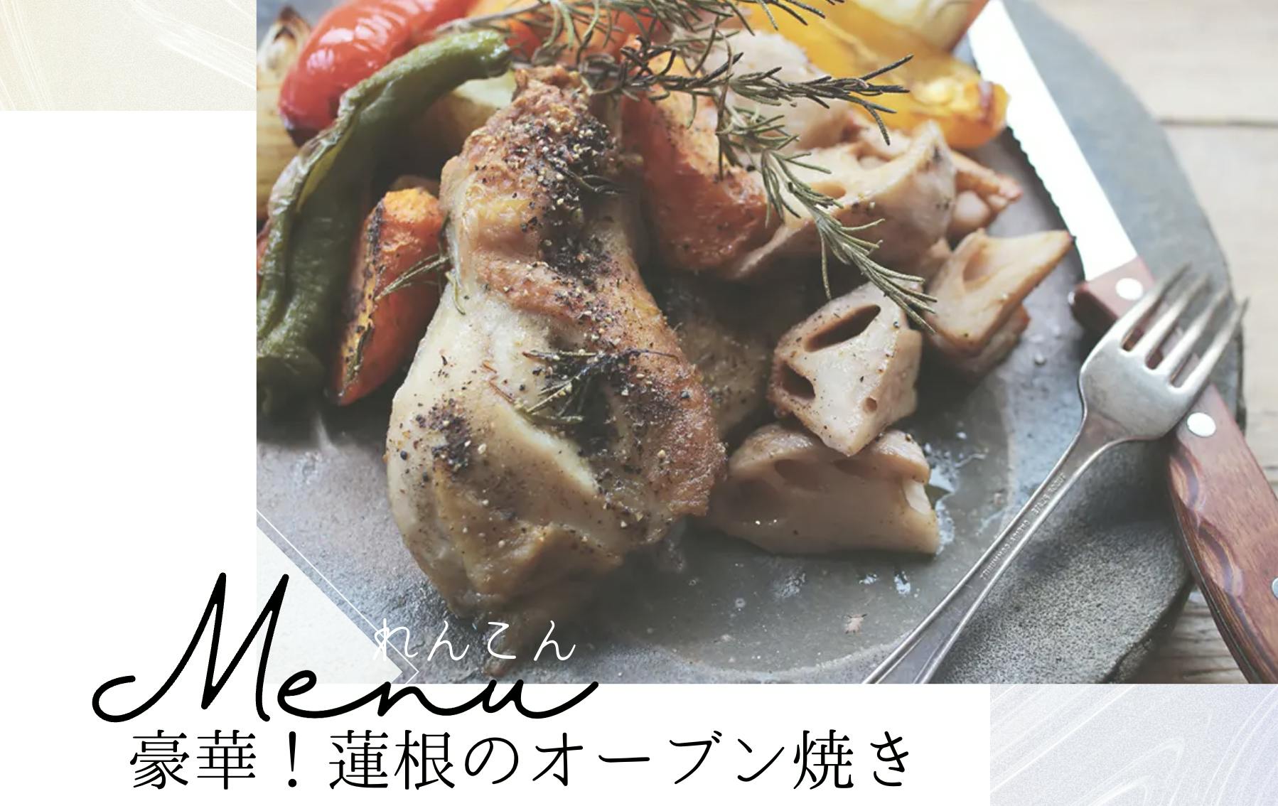 鶏もも肉をメインに、蓮根、人参、ジャガイモ、玉ねぎ、パプリカなどを高温のオーブンで焼いた豪華でボリュームのある一品。ボウルに材料全部を入れ、オリーブオイル、塩、胡椒、ローズマリーを揉み込む。それを250度のオーブンに入れ焦げ目ができるまで焼き付ける。
