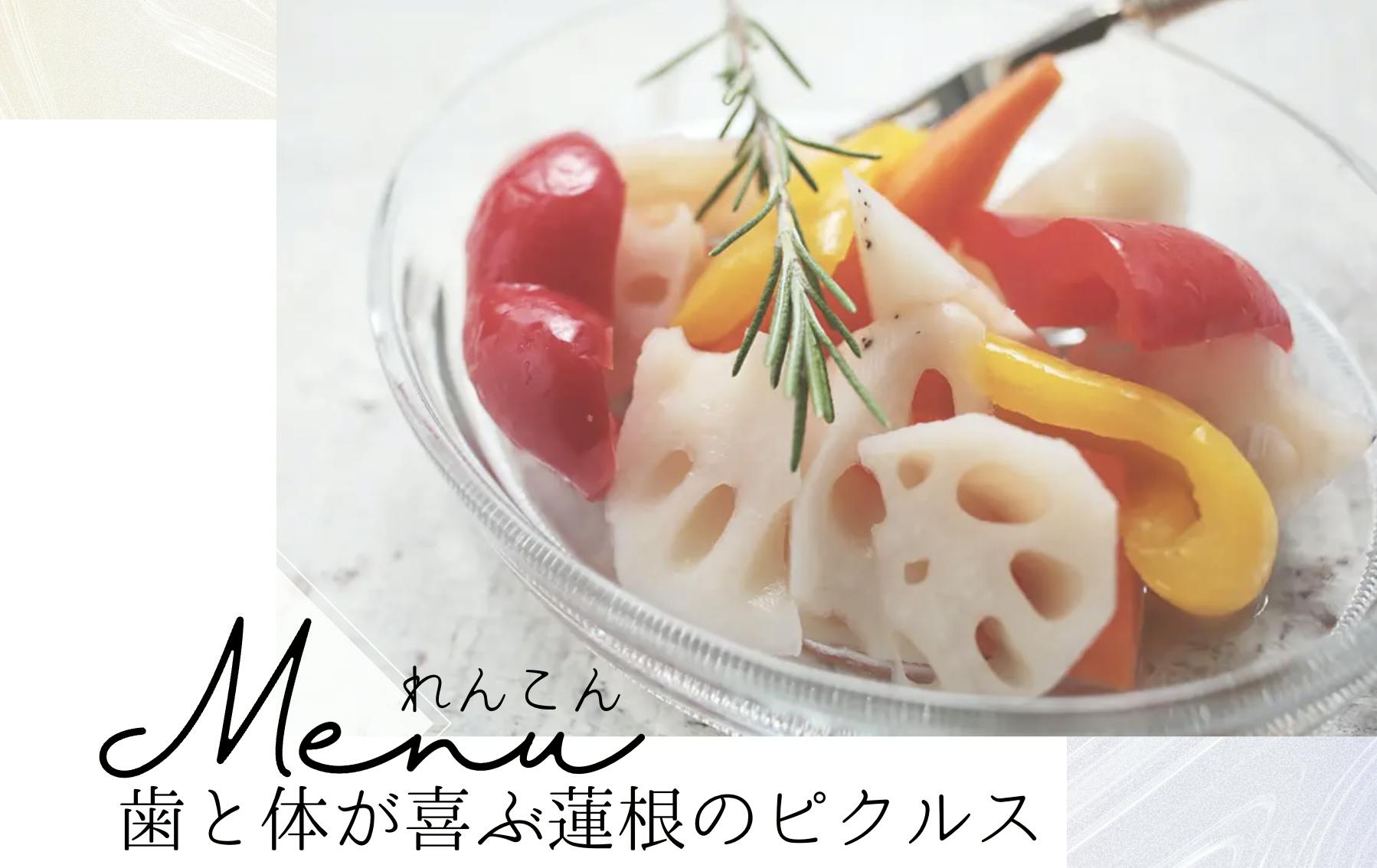 軽く茹でた蓮根とパプリカ、人参、セロリ、大根など大ぶりにカットしたもので作るピクルス。ビネガーの爽やかさと蓮根の歯ごたえ、コリコリといくらでも食べられます。