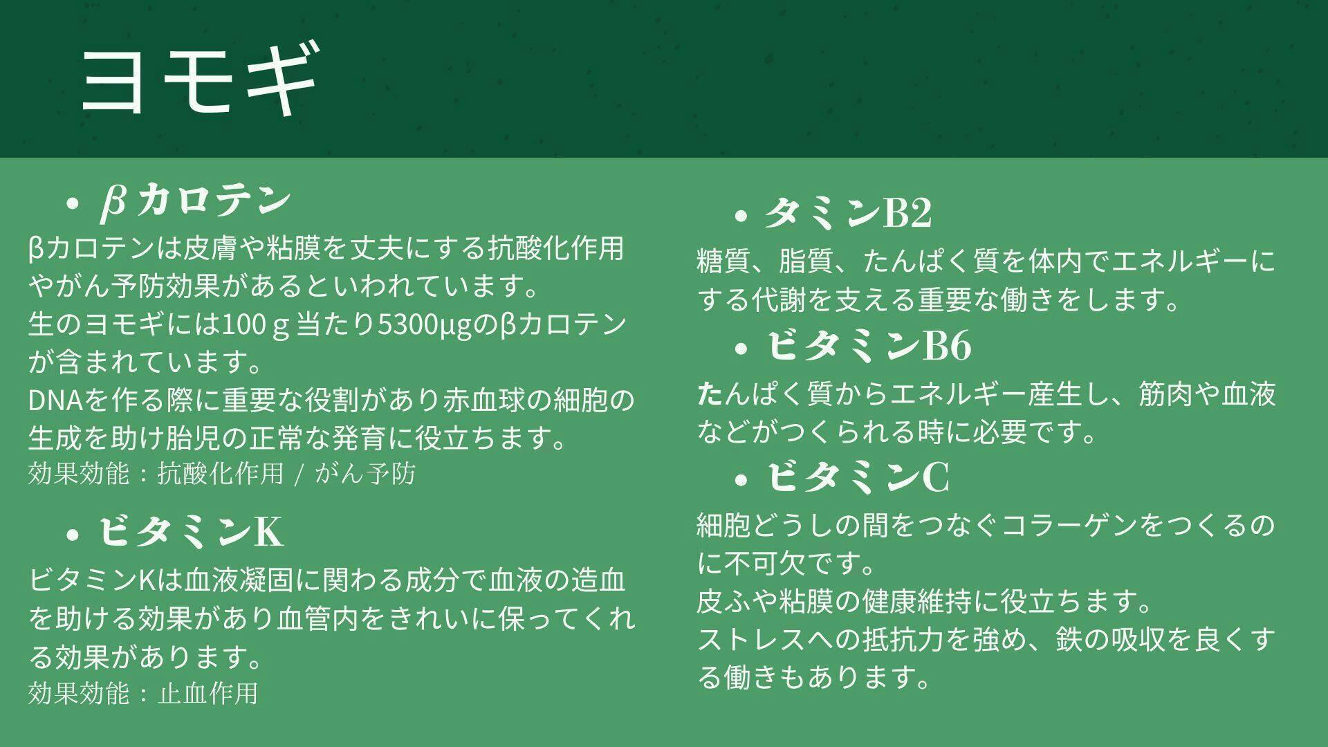 ヨモギについて調べていくと、ヨモギには殺菌効果があることやビタミンが多く含まれている事やβカロテンがほうれん草の10倍ほどある事や老廃物排出効果がある事など様々な効果があること、またヨモギの香りにはイライラ解消や安眠作用もある事が分かりました。