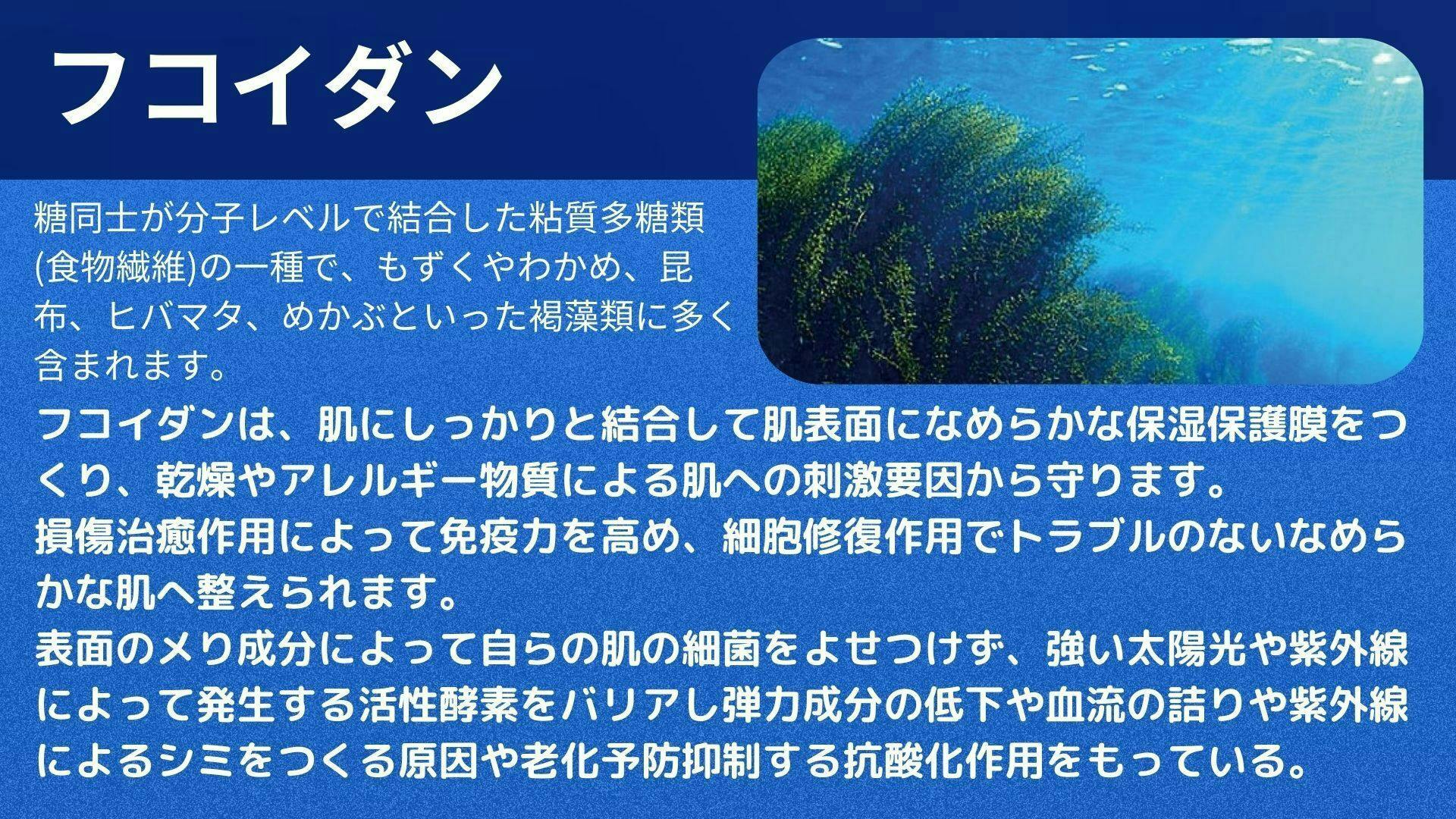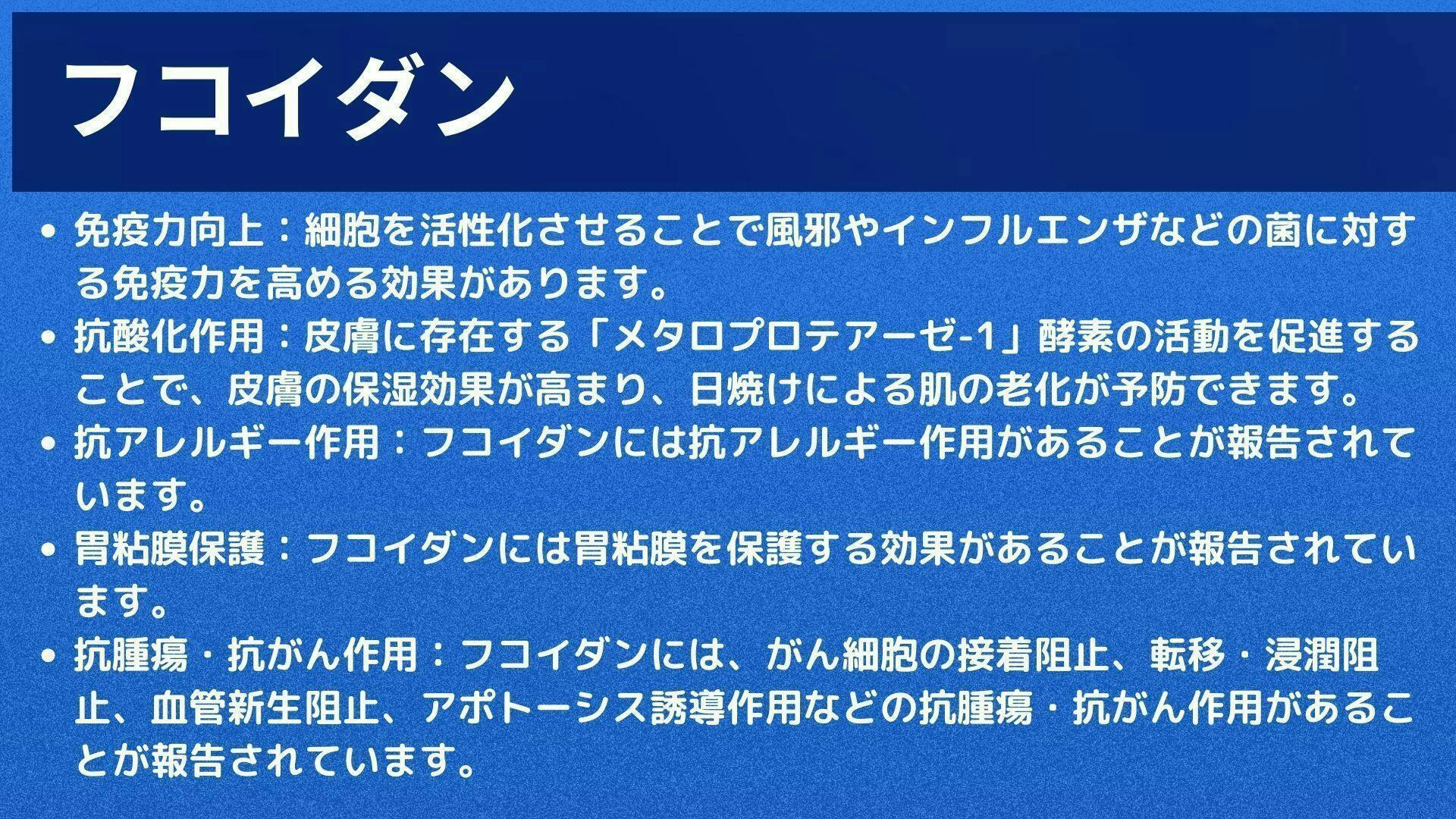 フコイダンは抗酸化作用、細胞修復作用があることや皮膚の保湿効果や免疫力を高めたり、老化予防、ウイルス増殖を抑える効果などがある事を知りました。