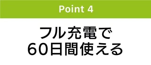 フル充電で最長60日間も使えるから、大事な会議前や出張先、緊急などで使いたい時にも活躍。