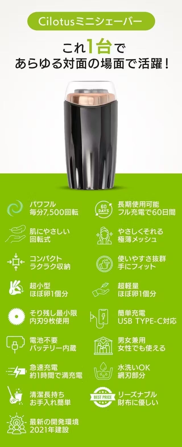 今回お届けする新商品「Cilotusミニシェーバー」は、お客様からいただいた様々な要望をベースに開発した新商品となっています。
