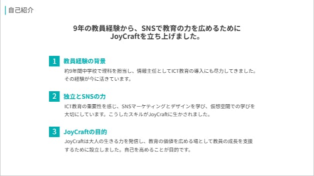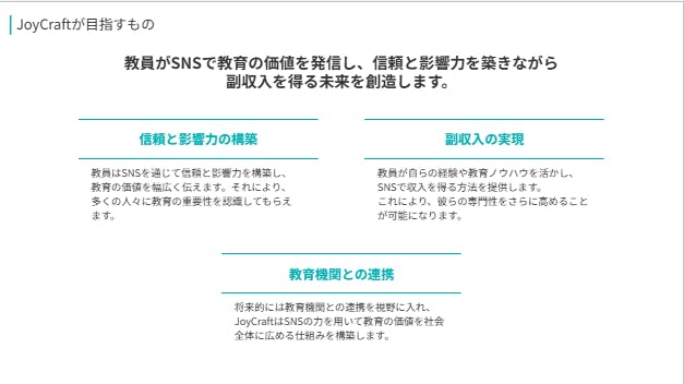 「JoyCraft」が目指すのは、先生方がSNSで自分の経験や教育への想いを発信し、信頼と影響力を築きながら、付加価値としての副収入も得られることです。